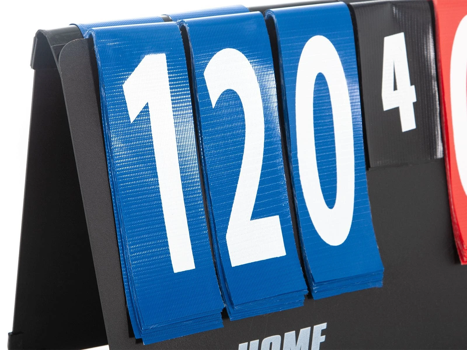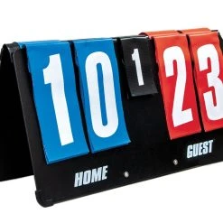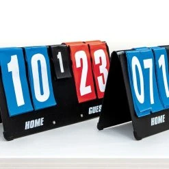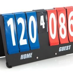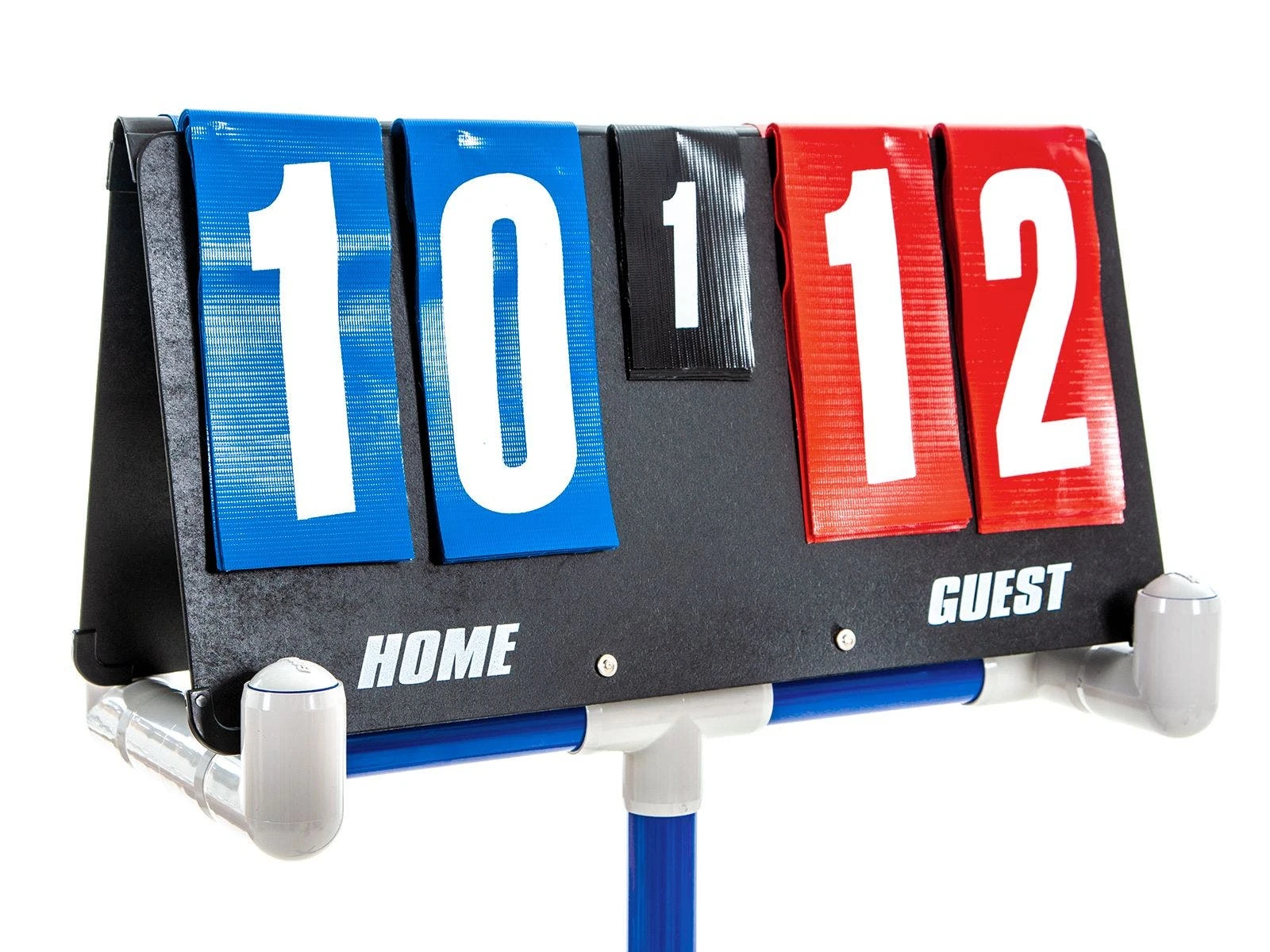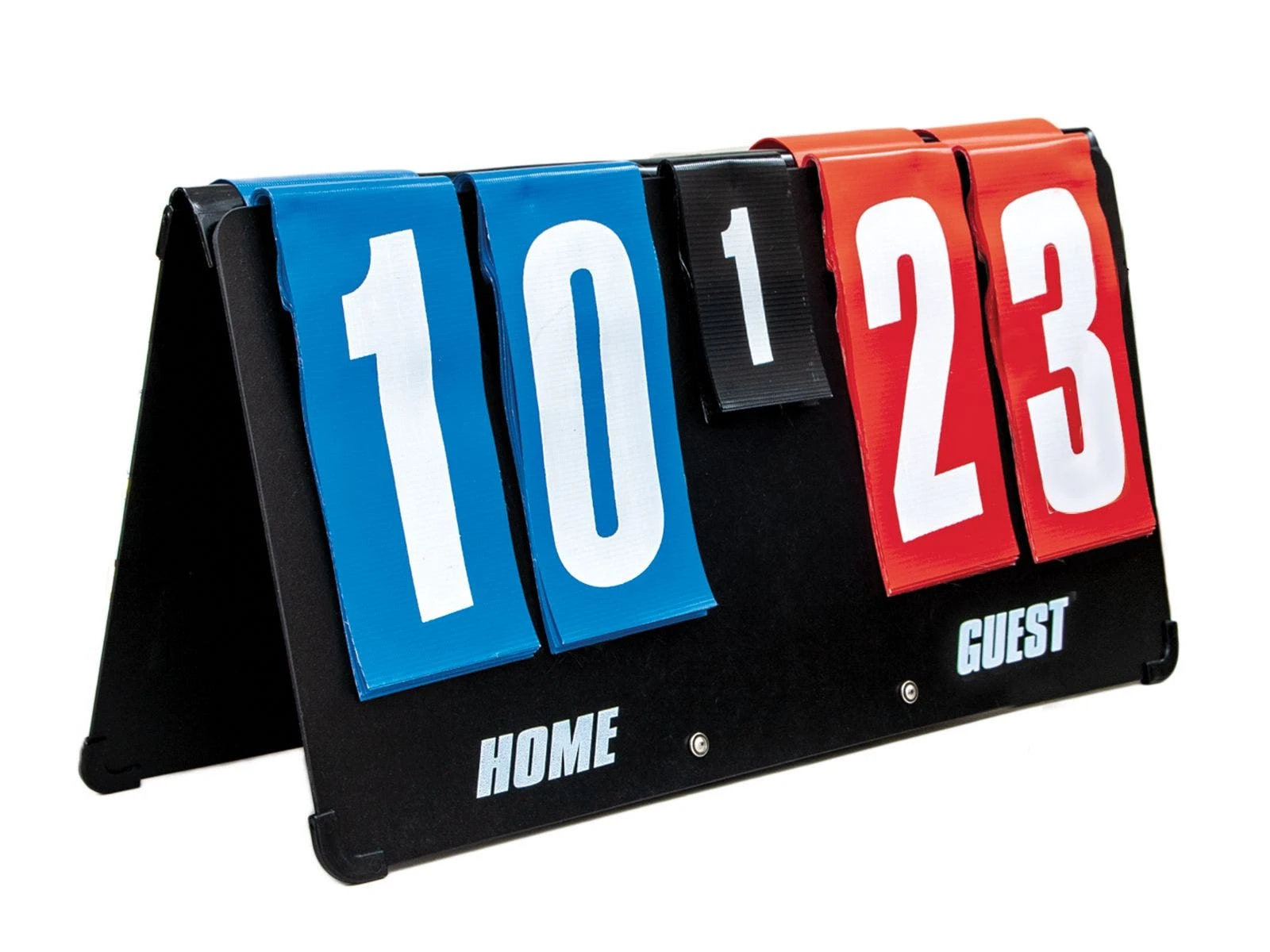 Operators simply flip numbers over to display the score. Scoreboard also displays period or quarter. Compact and lightweight, it is easy to pick up and carry this scoreboard. It folds into itself for compact storage and to protect the numbers when not in use. 5″L handles make transportation easy. Use as a tabletop scoreboard or extend the viewing height with a stand.