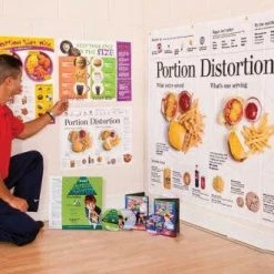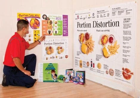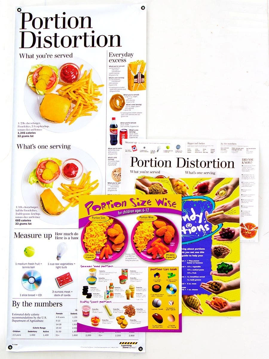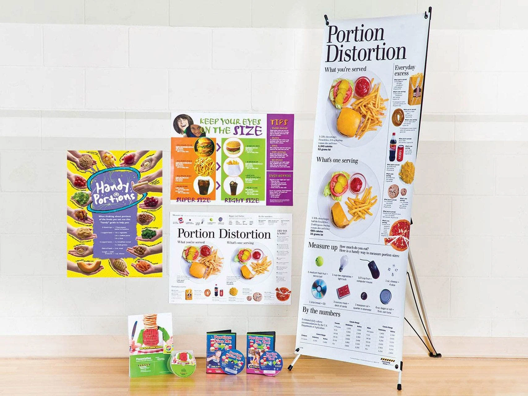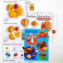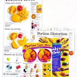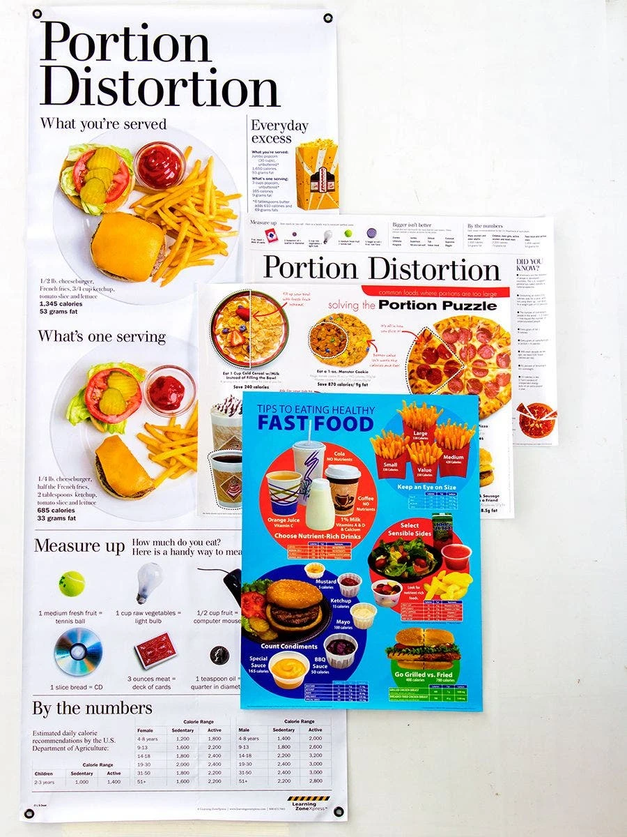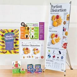Poster/Banner Packs include a 2′ x 5’3″ highly-durable vinyl Portion Distortion banner to hang on wall or display with a stand, a smaller Portion Distortion poster, and two 18″L x 24″W laminated posters. Elementary Pack includes Portion Size Wise poster and Keep Your Eyes on the Size poster with examples of oversized portions versus properly-sized portions. Junior/Senior High Pack includes Portion Puzzle poster outlining serving sizes and Fast Food poster with tips on making better choices at fast food restaurants.