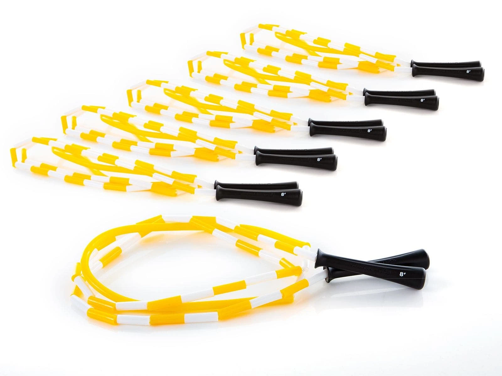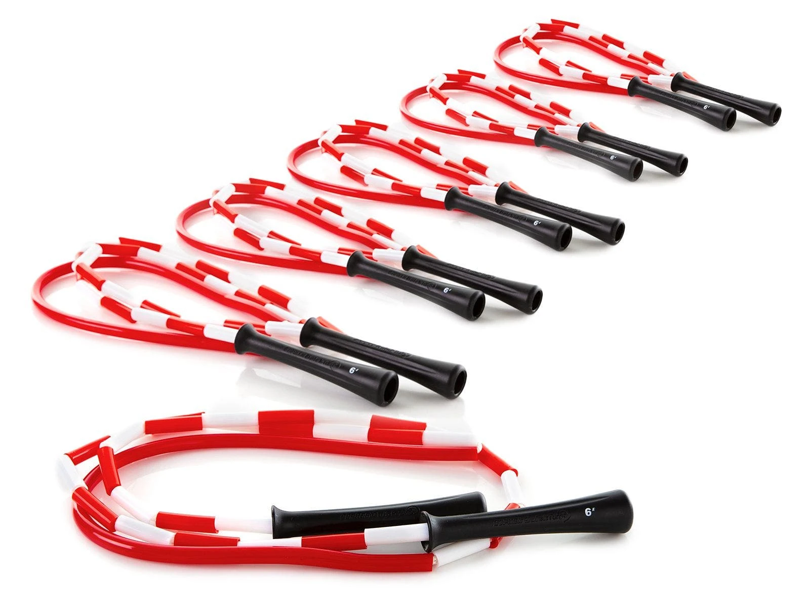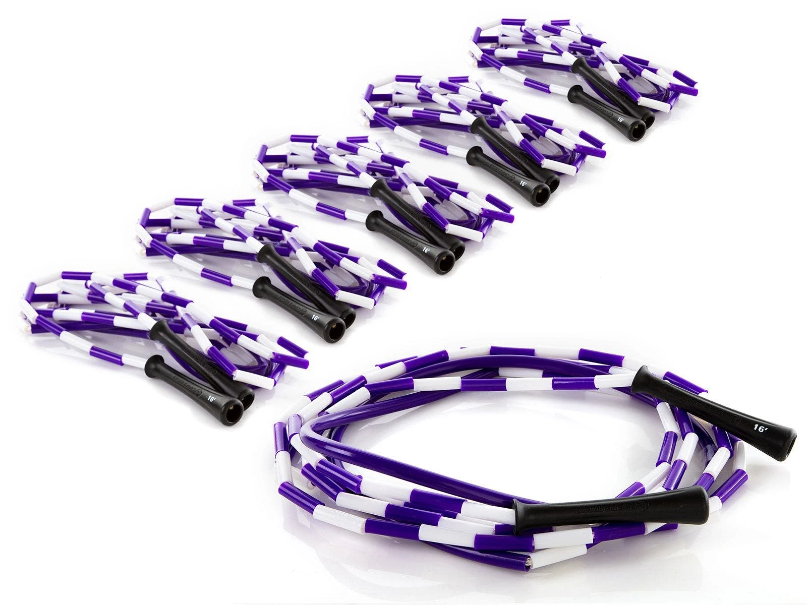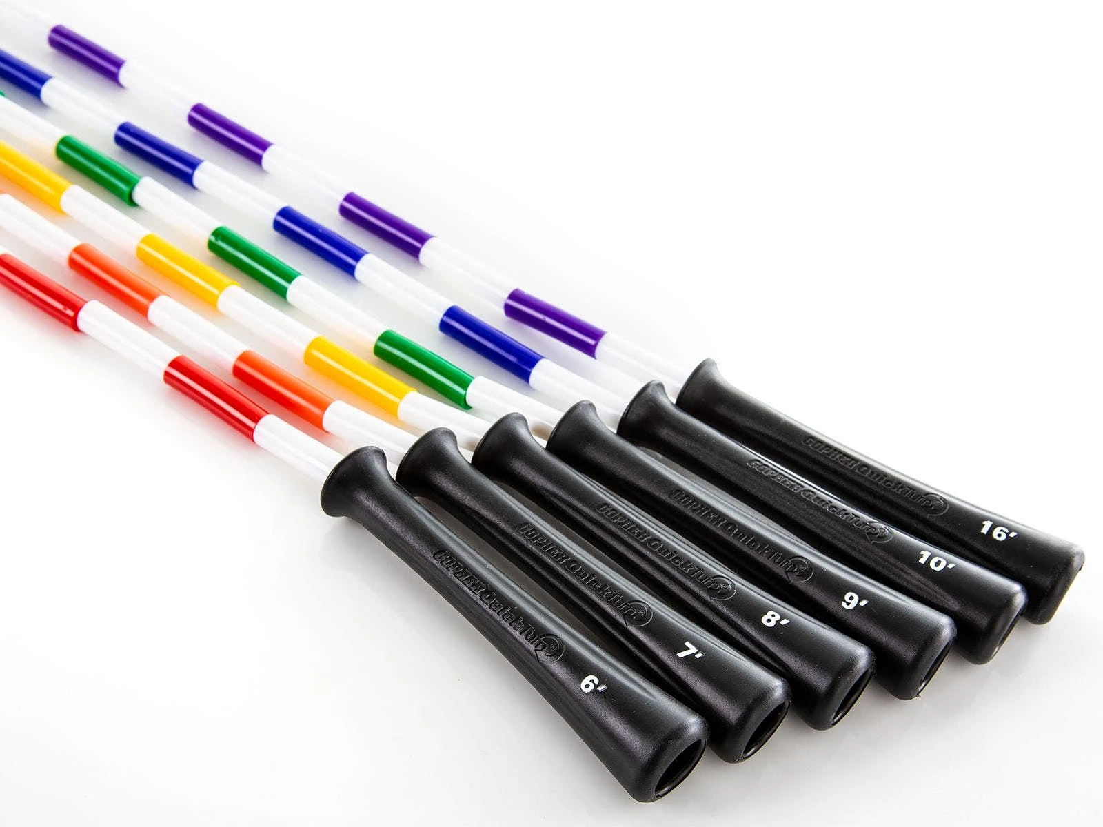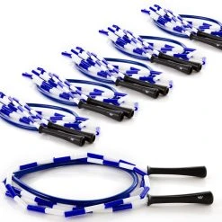 The PVC segment in the middle of each rope resists wear and won’t leave marks where the rope makes contact with the ground. Ergonomic 5″L handles provide a comfortable grip. The color of each handle, along with a large marking, identify the rope’s length. This makes it extremely easy for students to grab a rope and go class after class as they an easily remember what color rope fits them.
