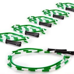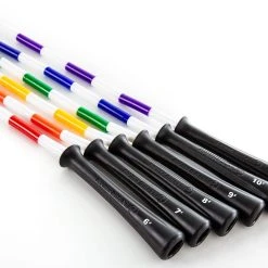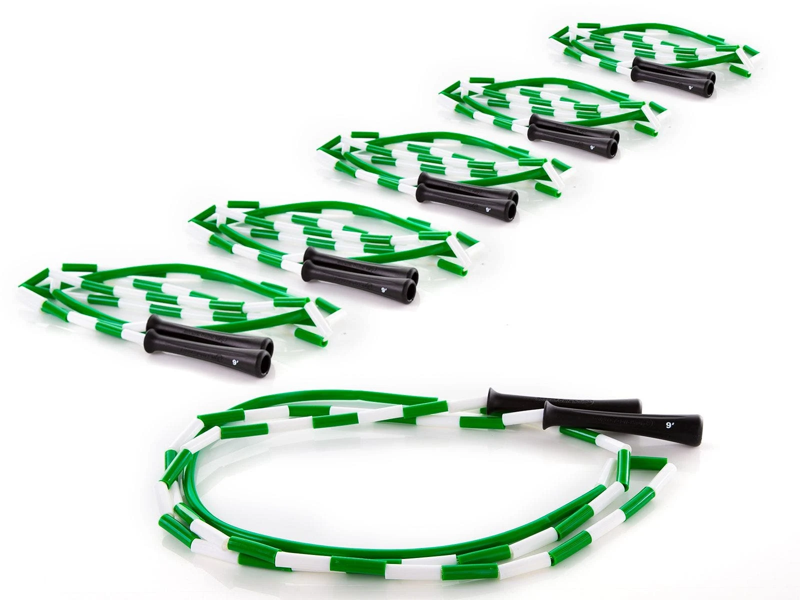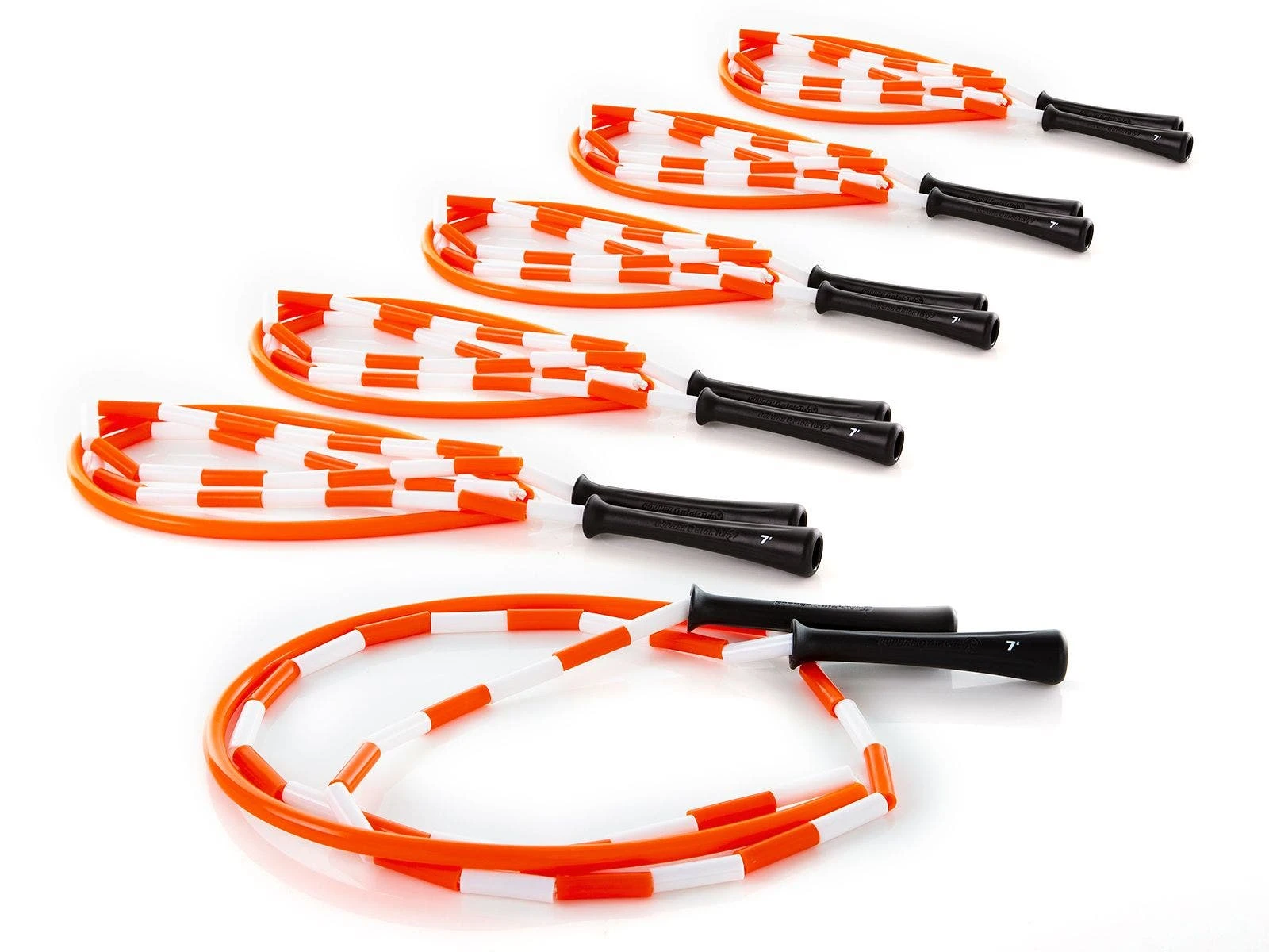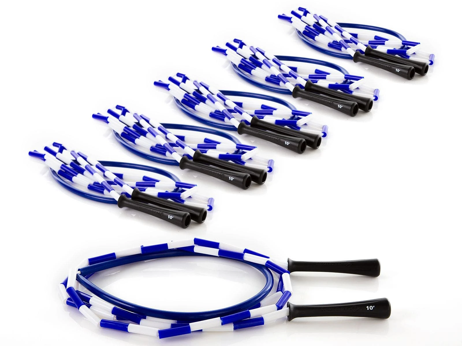 The PVC segment in the middle of each rope resists wear and won’t leave marks where the rope makes contact with the ground. Ergonomic 5″L handles provide a comfortable grip. The color of each handle, along with a large marking, identify the rope’s length. This makes it extremely easy for students to grab a rope and go class after class as they an easily remember what color rope fits them.
