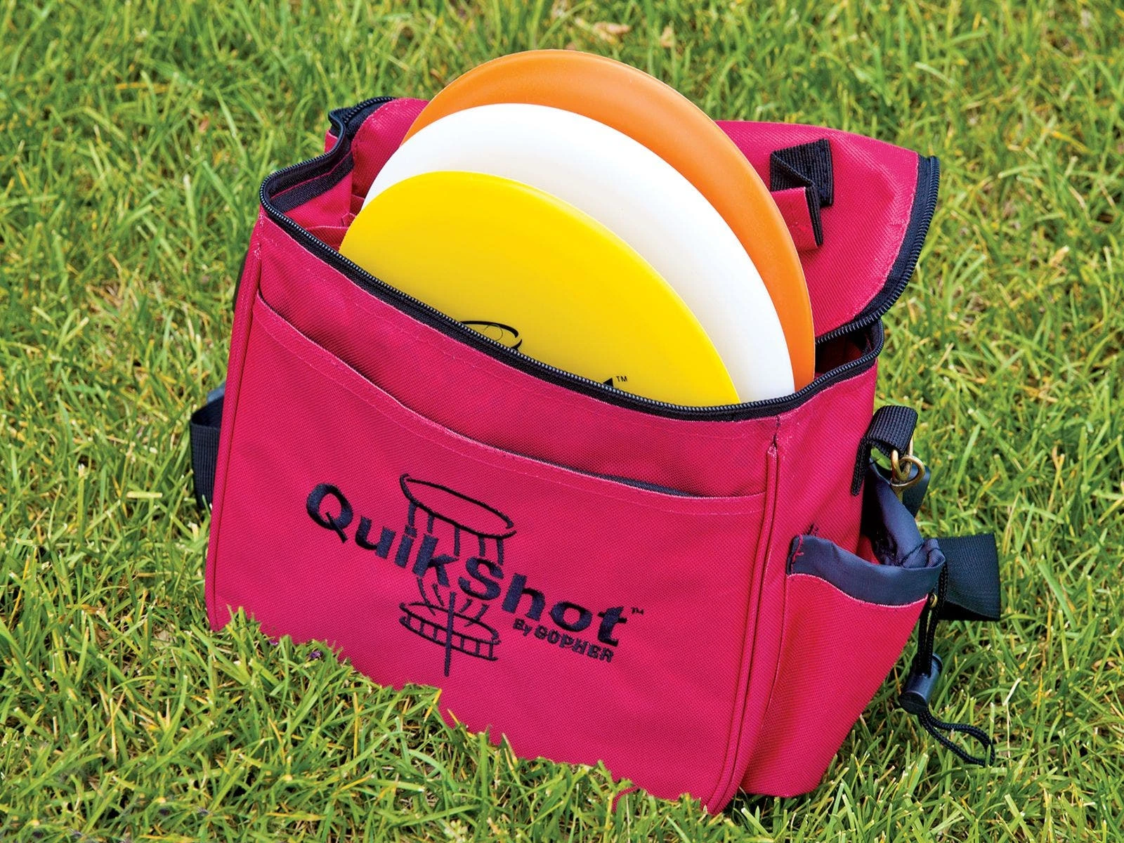 Easily carry your QuickShot disc golf equipment across the course with the convenient QuickShot carrying bag. The canvas bag holds 3 discs so students can carry a driver, mid-range disc, and putter for a well-rounded playing experience. Dividers separate the discs for easy identification and a shoulder strap makes transportation a breeze. Available individually. Discs not included.