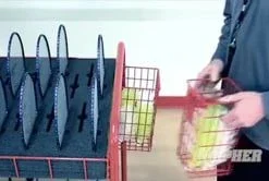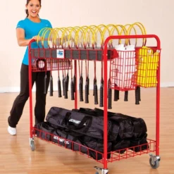 Customized for badminton equipment, every feature treats your equipment like royalty. Nothing makes transporting and storing your badminton equipment easier, safer, or more convenient. The shelf gently cradles up to 30 racquets in laser-cut foam pockets, so there’s no damage to strings or frames during transport. Two removable shuttle baskets hold a total of 48 shuttles (loose or in tubes). The lower basket is perfectly sized to hold up to 6 Gopher UltraNet portable net systems. The powder-coated steel frame glides on locking 3″ dia metal casters. Assembly required. 39″L x 21″W x 42″H; 38 lb.