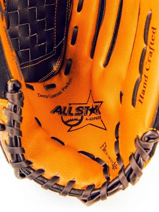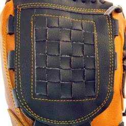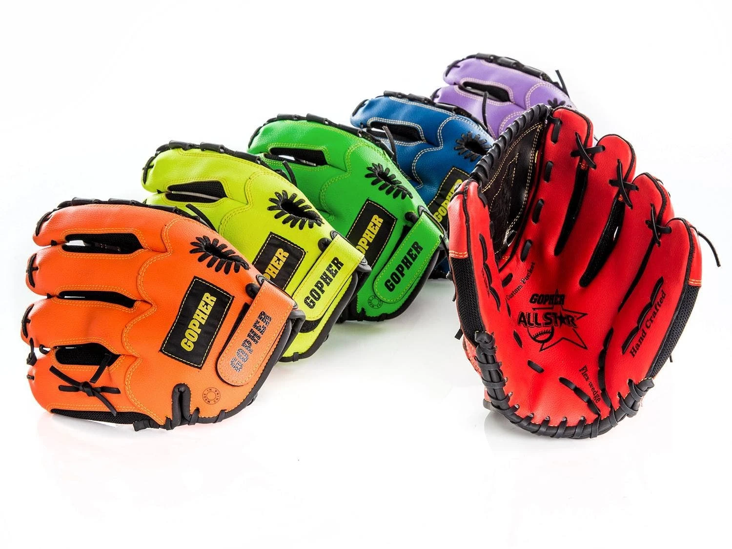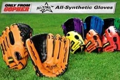 Leather-like synthetic material reduces break-in time on these gloves, while padded palms cushion players’ hands upon impact. These gloves feature a fully-laced bridge for added strength and a woven web for secure catches. An adjustable strap makes it easy to quickly find the perfect fit, which is important in settings with multiple players sharing gloves. Lightweight construction is ideal for beginners.
