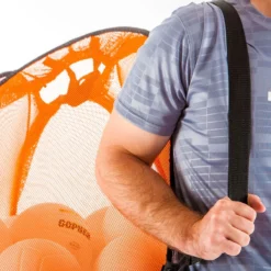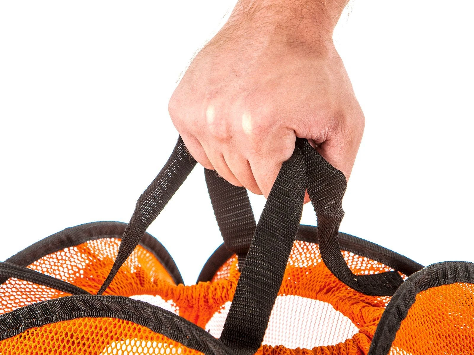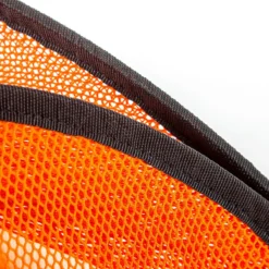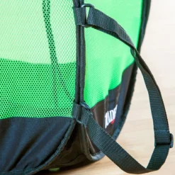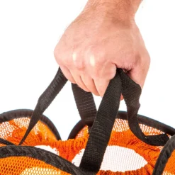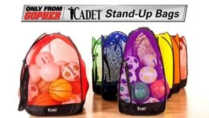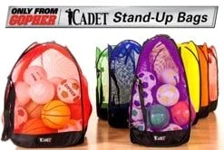 These large mesh standing bags stay open and upright for ultra-convenient access, then fold up in seconds for transport and storage. Polyester mesh construction allows for easy identification of contents, as well as fade-, moisture-, and shrink-resistance. A canvas bottom provides a strong and supportive base, allowing you to pile in balls for quick storage! Two top handles and shoulder strap allow for quick transportation.