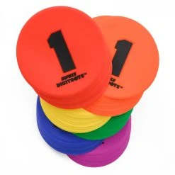 Molded-in numbers never fade and add grip to the tops of spots. A tacky bottom side ensures the markers stay in place on gym floors, even when stepped on. 9″ dia.