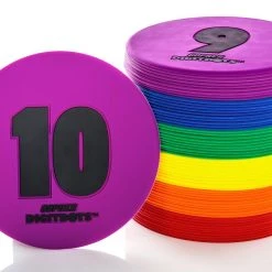 Molded-in numbers never fade and add grip to the tops of spots. A tacky bottom side ensures the markers stay in place on gym floors, even when stepped on. 9″ dia.