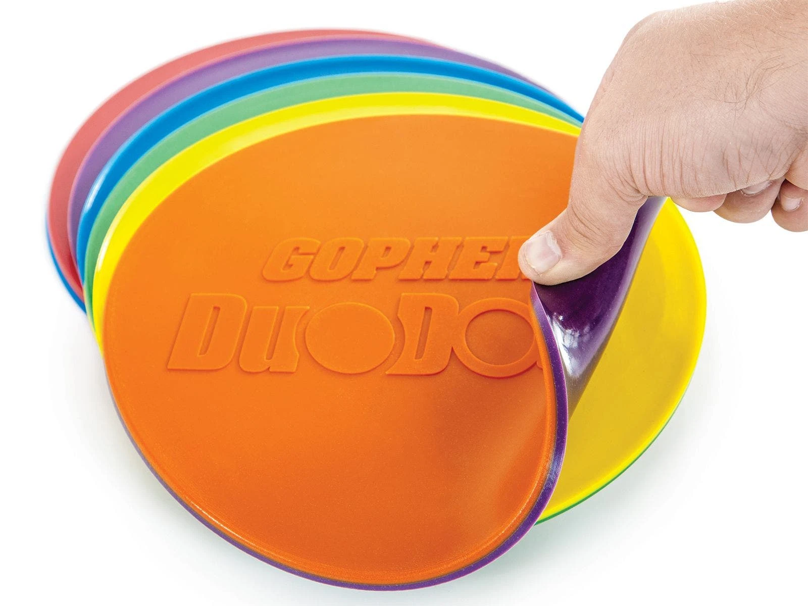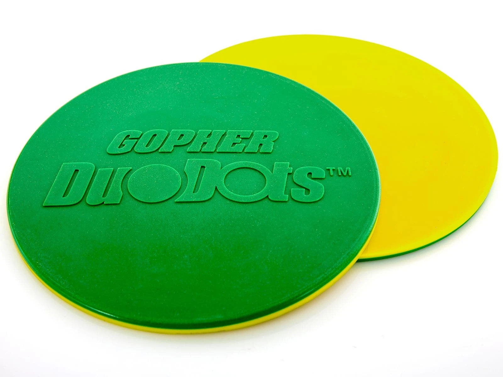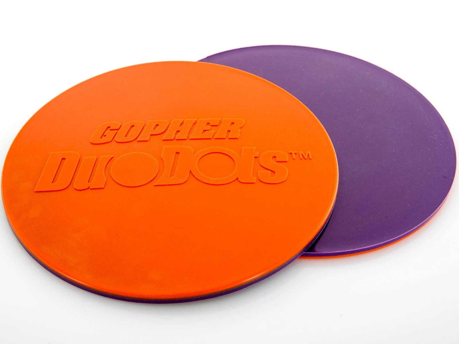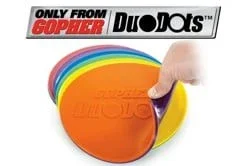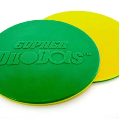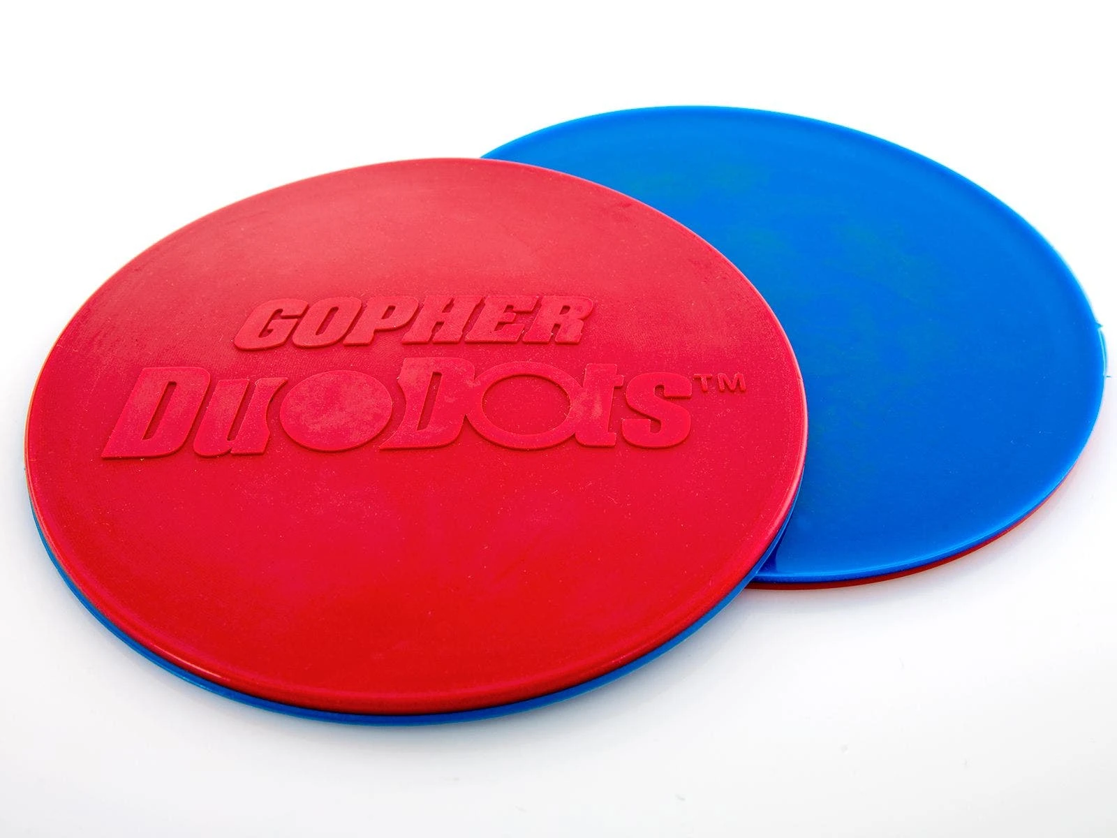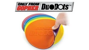 These versatile gym floor spots have a different color on each side, providing instant variety to hundreds of activities! The durable spots grip the floor and withstand heavy use, indoors or out, and include the following color combinations: red/blue, green/yellow, and orange/purple.