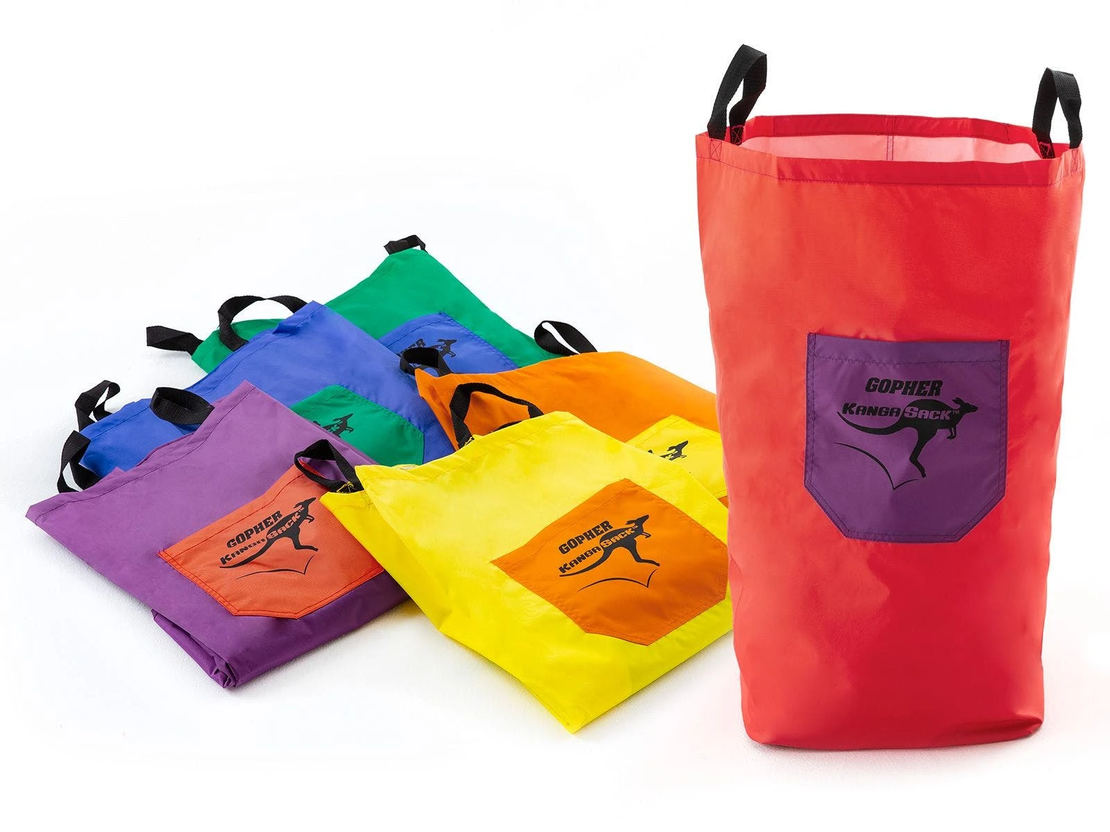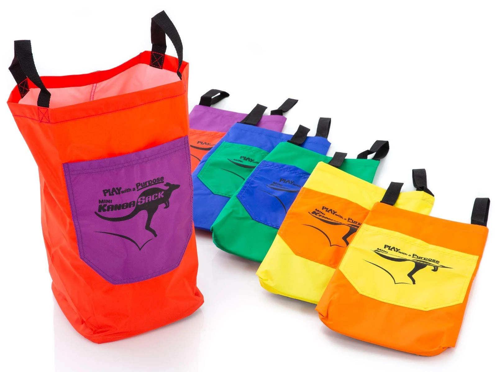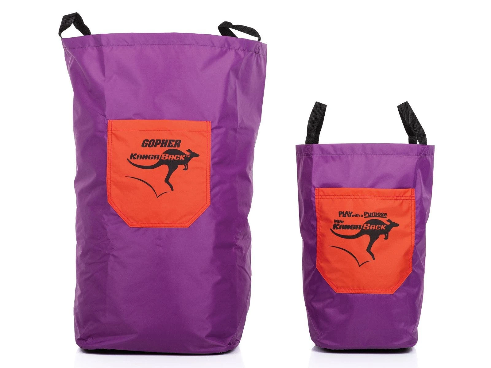 Durable nylon material features slip resistant bottom for enhanced safety. Nylon handles adds security during a game or relay. Standard KangaSack features 2 sets of handles—low for younger kids and higher up for older kids and adults. The Mini option is smaller for the youngest kids, making it ideal for ages 2 to 5. Bags include hook-and-loop fasteners on the back for flag attachment. Activity instructions included.