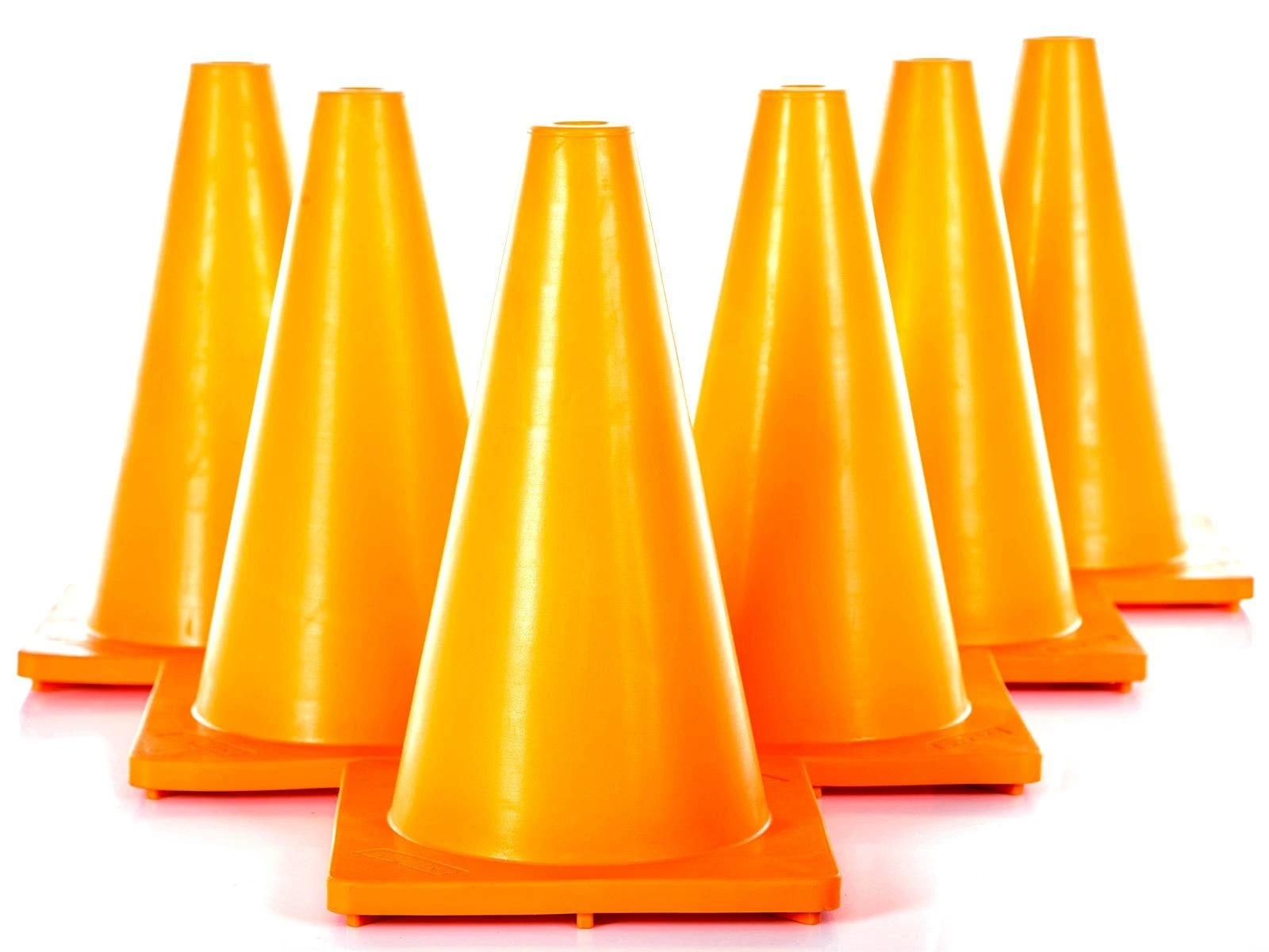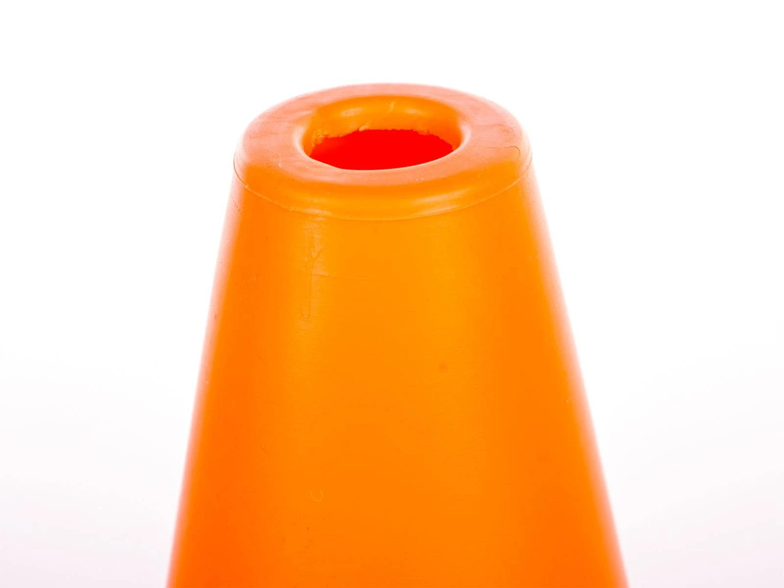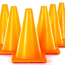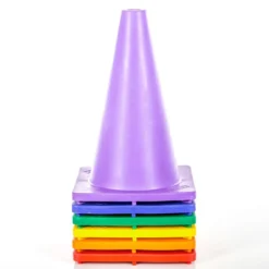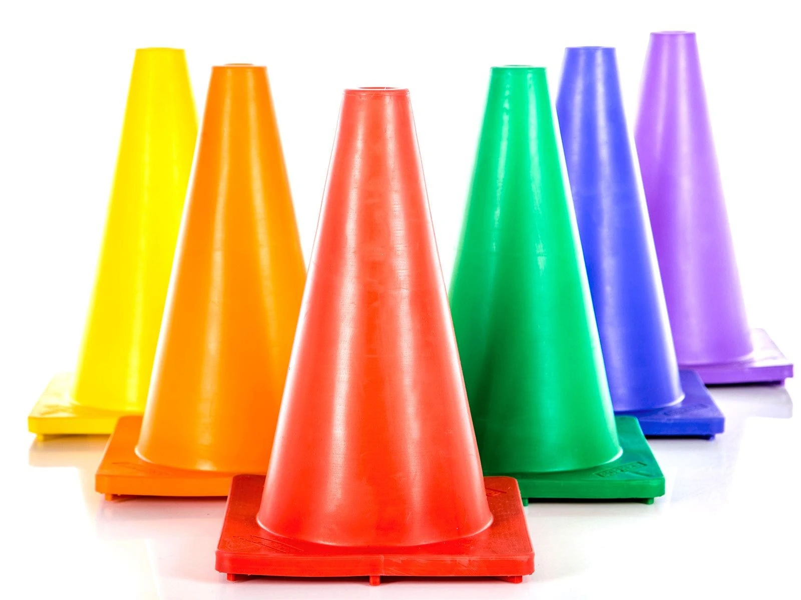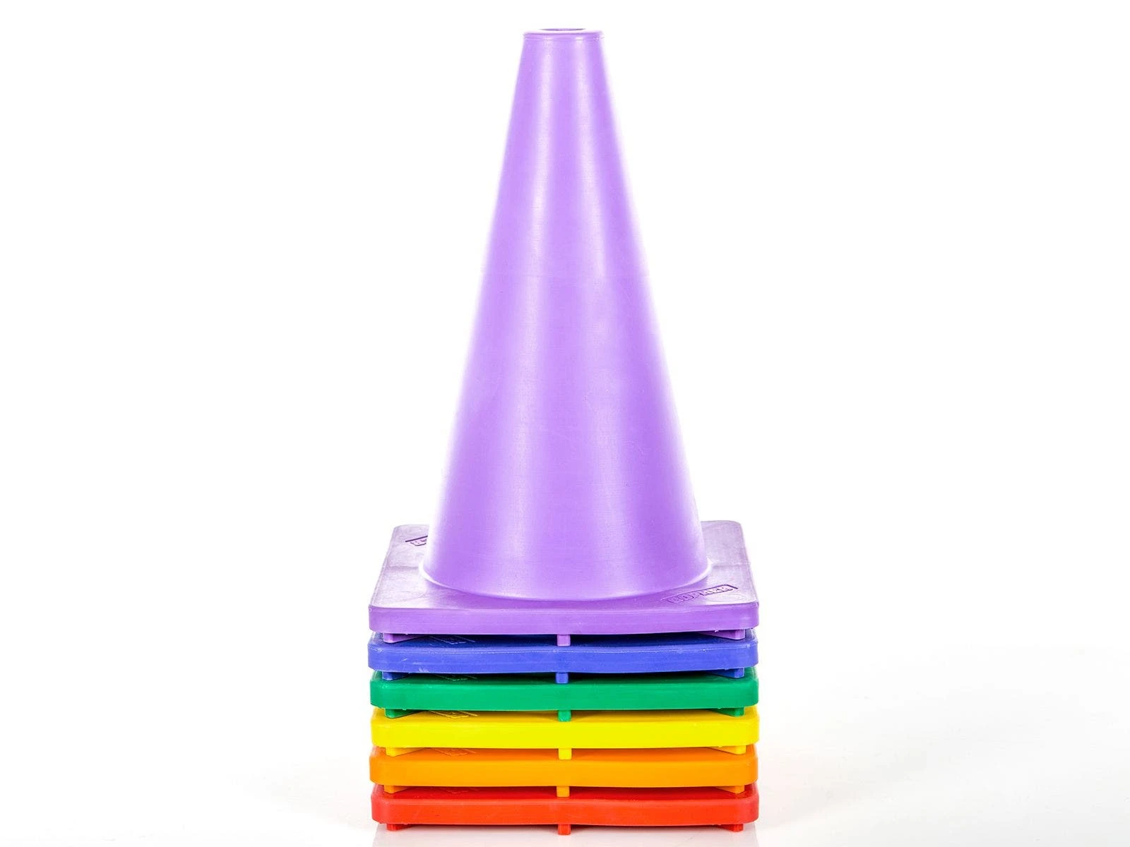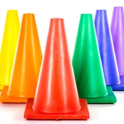 More pliable than other cones, these flexible cones are constructed with thermoplastic that quickly springs back when crushed, keeping the cone intact and students safe on impact. Base includes 8 TPR feet to grip the floor and keep cones in place when lightly hit. Choose individually in Orange or sets of 6 in Rainbow colors and Orange. 12”H.