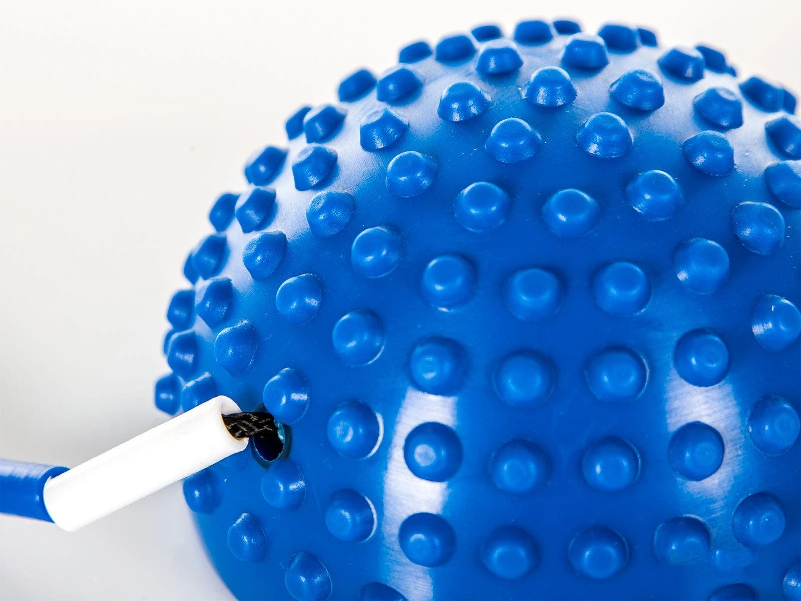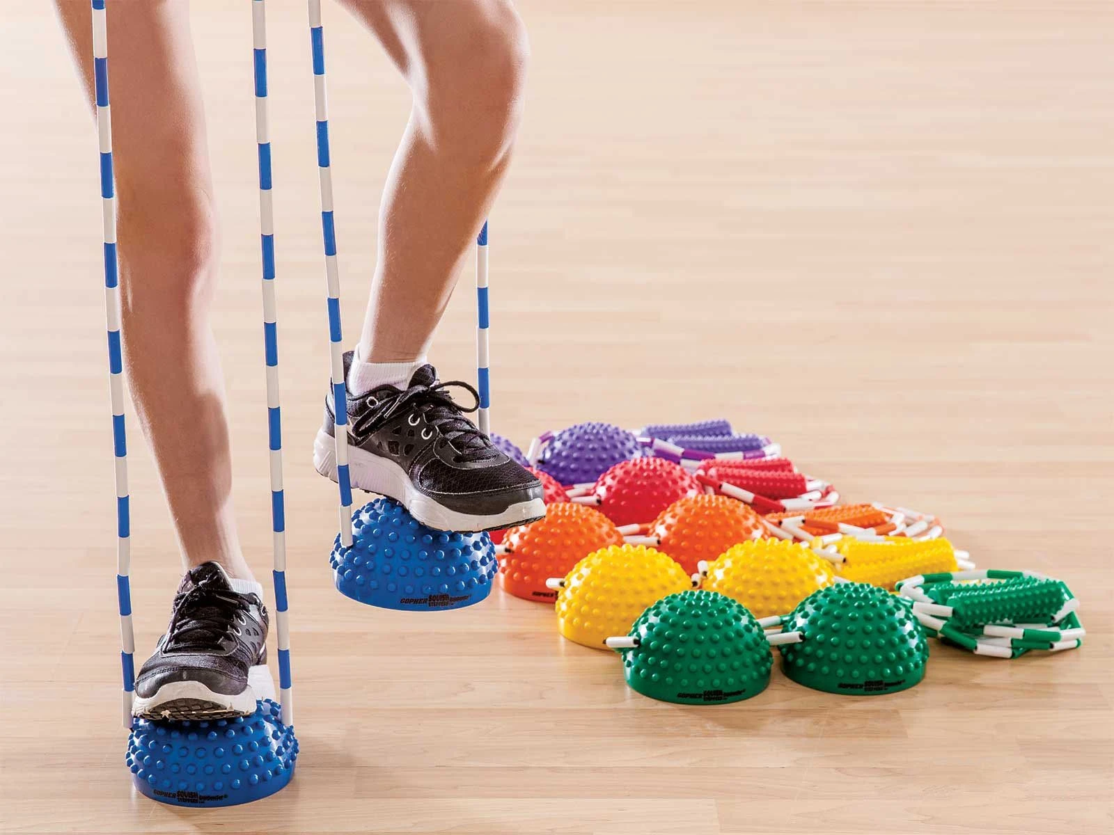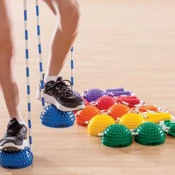 The plastic segments on this balance stepper for kids and teens prevent the ropes from tangling, while the soft and tactile handles are easy to grip. A bumpy, domed surface paired with the inflatable instability of the squishy steppers teaches students about balance and stability while also working muscles in their legs.