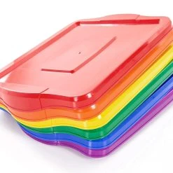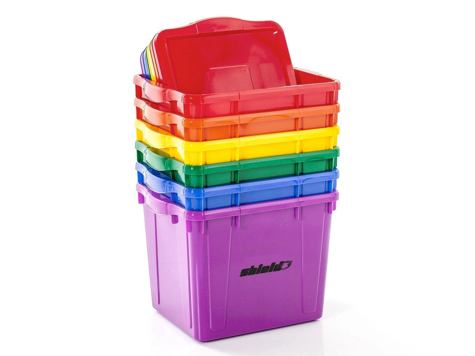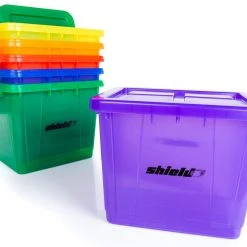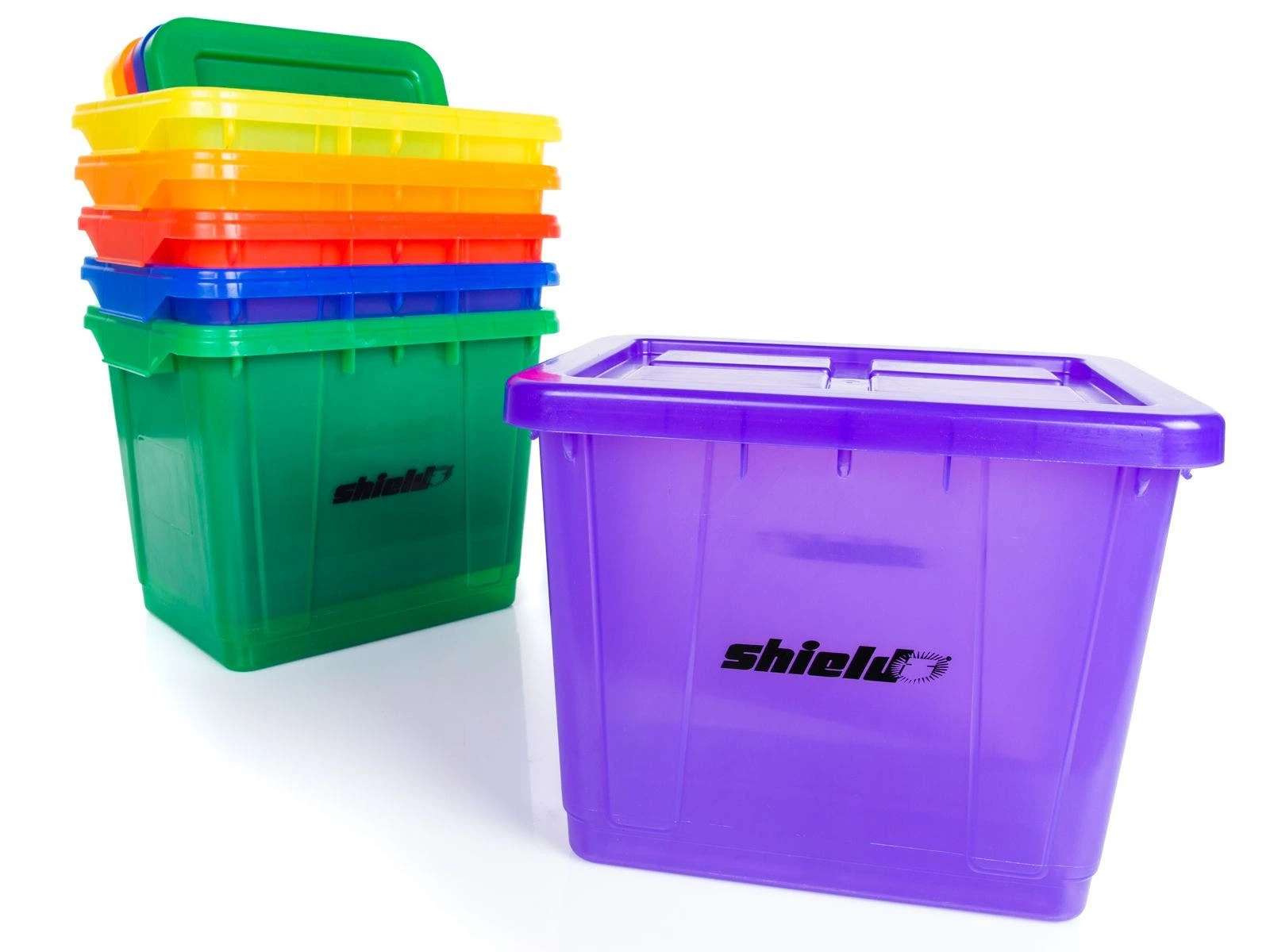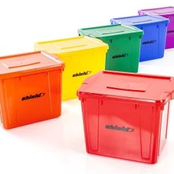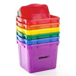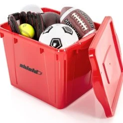 Organize a wide variety of gear in these 7- and 16-gallon storage totes. Made of high-density polyethylene for dependable, long-term use. 7-gallow totes are see-through for easy identification of contents, while the 16-gallon totes have non-transparent sides to better conceal contents. The totes include handles for easy transportation, locking lids, and stack when not in use. They also feature drainage holes, allowing moisture to escape and increase the longevity of the equipment inside. The vivid colors make them ideal for use as color-coded stations during games and activities. 7-gallon totes are 15-3/4″L x 11-1/2″W x 12-1/2″H; 4 lb. 16-gallon totes are 18-3/4″L x 15-3/4″W x 15-1/2″H; 5 lb.