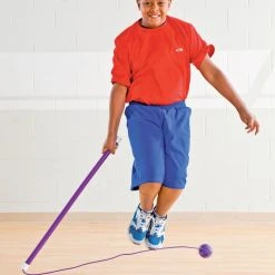 The strong plastic construction of the baton, nylon rope, and plastic ball makes these ideal for use on any surface. The weight of the ball ensures continued trajectory even when it skips on the ground, without damage or interruption to the activity. This economical and fun teaching tool gets the whole glass jumping at a great value. Baton is 32″L; rope is 42″L.