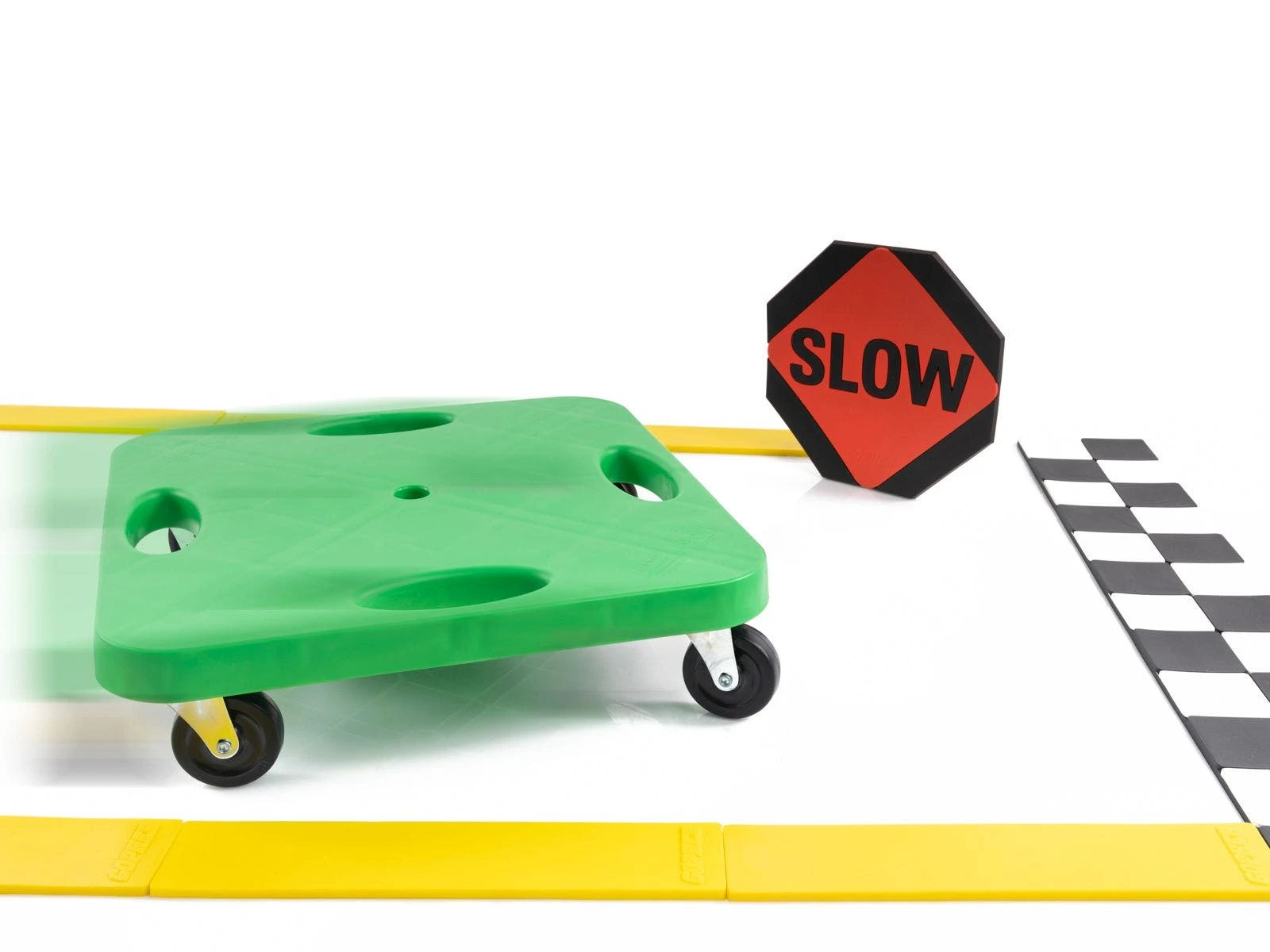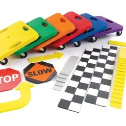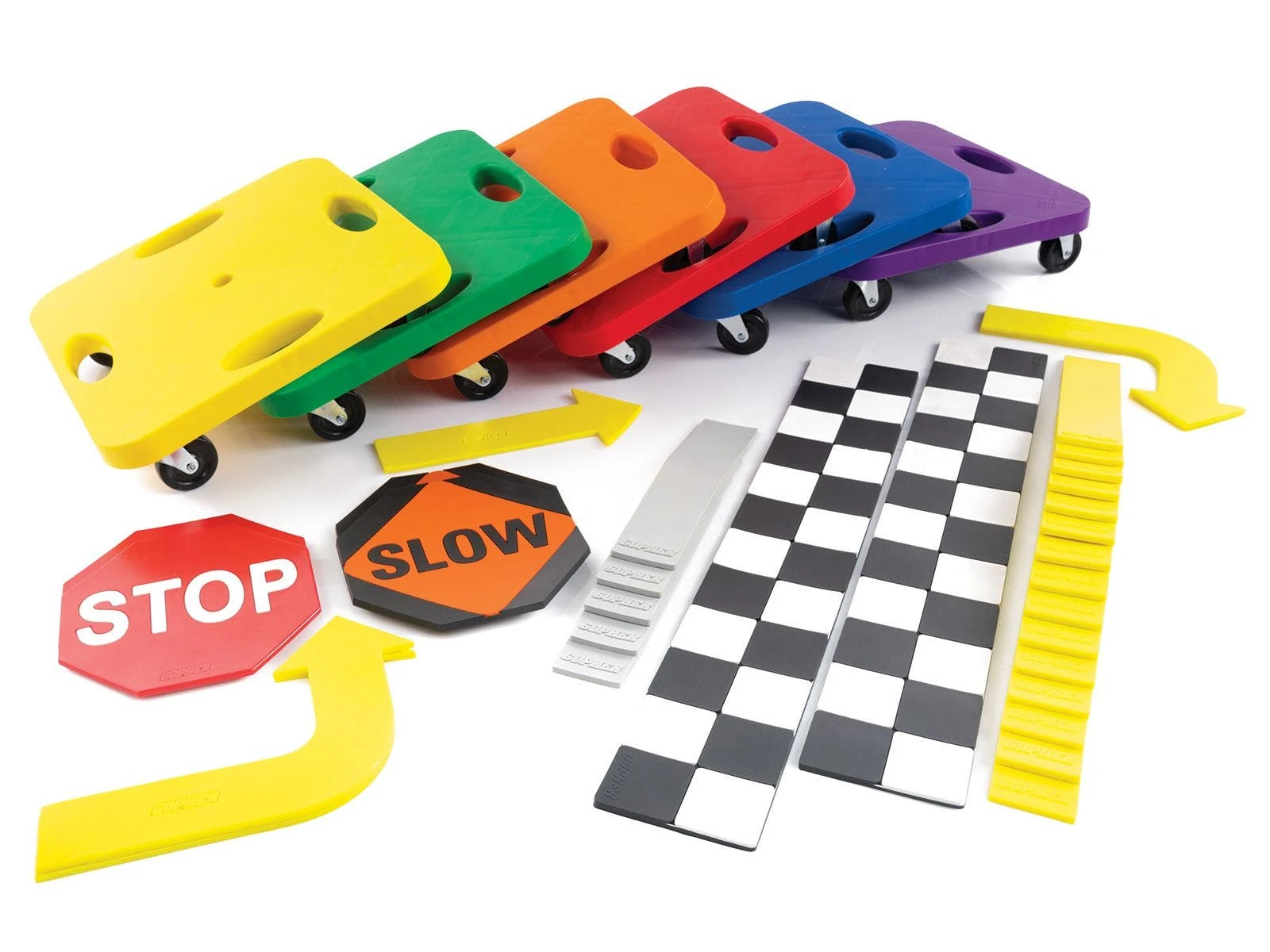 Place the poly spots to make a track or course for students to navigate while riding on our Rainbow SteadFast Scooters. Use the spots in the gym, classroom, hallway, outside, or wherever you want to set up scooter games. Place the black and white, start and finish lines where desired, then use the remaining spots to complete the track! Have students follow the straight poly line strips or use the directional arrows to curve or turn. Add in additional signs to encourage them to slow down or stop. Durable vinyl construction stays in place when stepped on. All spots are 1/4” thick. Complete scooter pack incudes 6 scooters and 31 directional poly spots.