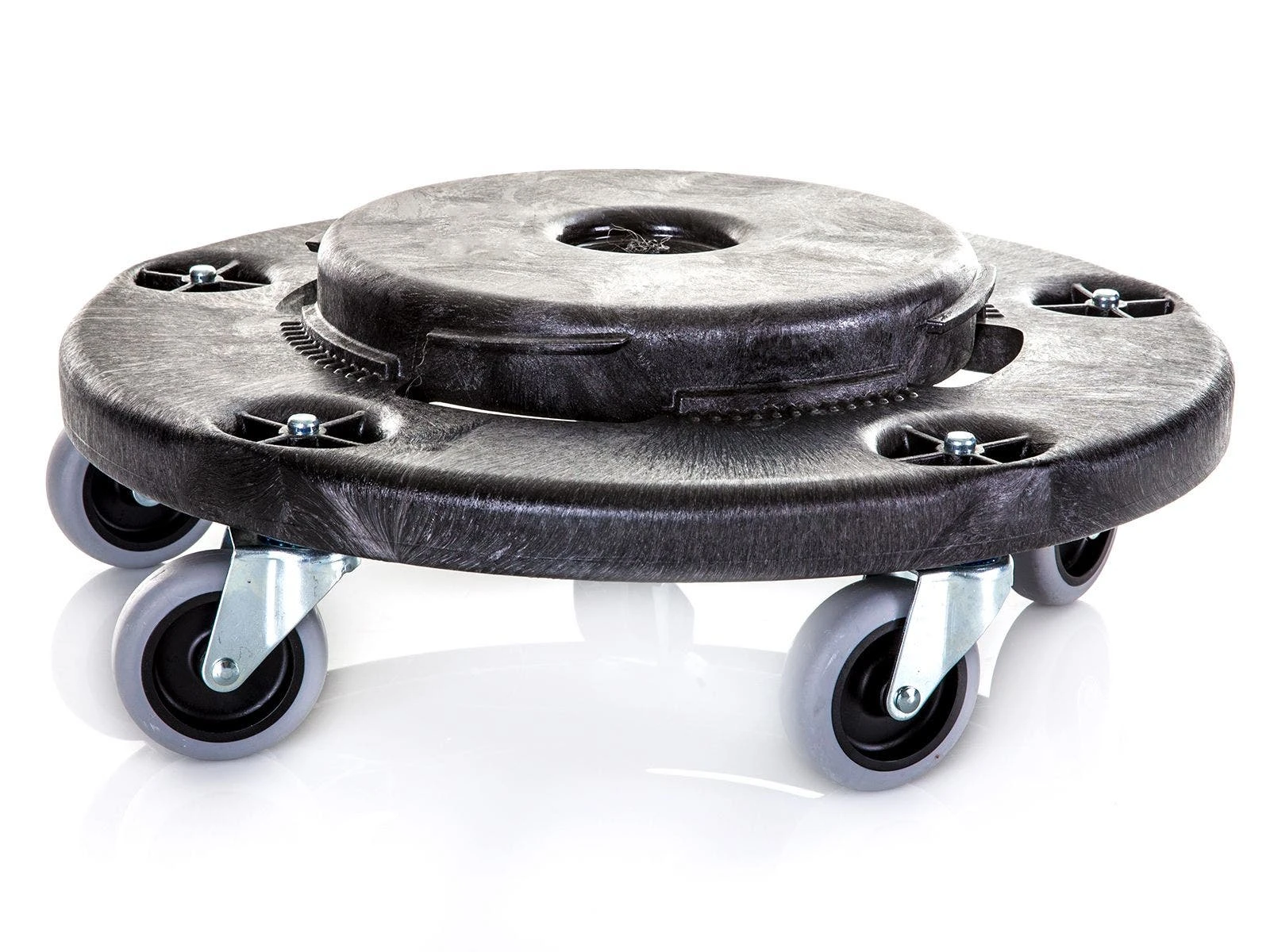 These rolling bases are designed to be used with both sizes of Rubbermaid Round Containers, creating an easy solution to transporting bins of equipment. Designed with 5 non-marring and agile swivel casters and a locking feature that secures bins directly to the base, transporting a full load is made safe and easy. 250 lb capacity.