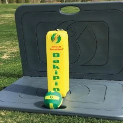 Lightweight 6″ dia ball has an inflatable rubber bladder and neoprene cover, keeping it soft and lightweight. The bright colors make it easy to spot the ball as it flies through the air. Foam BakiPins (22″H x 6″ sq) are covered in nylon and include a drawstring for easy carrying. They also feature a cloth sandbag bottom to keep the pins upright.