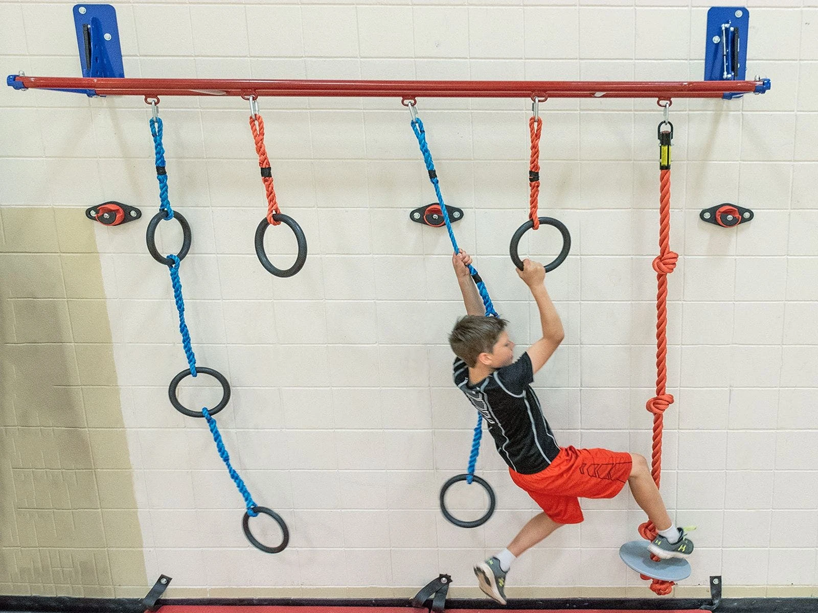 Fun yet challenging ninja obstacles combine with any traverse wall to develop coordination, upper body strength, and spatial awareness. Easily mount between or above traverse walls using powder-coated steel 84″W x 24″D frames and brackets to extend the traversing path or add a new dimension to the experience. Mounting brackets easily fold up to keep climbing elements out of reach between classes.