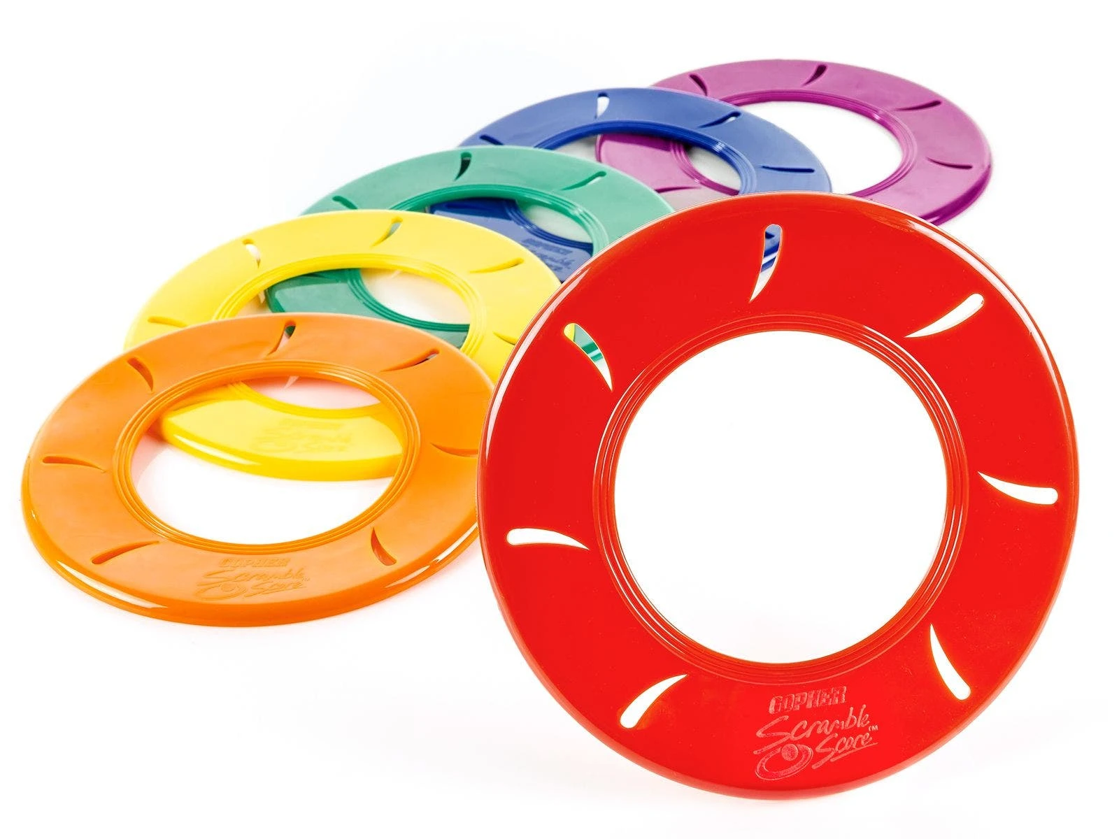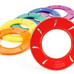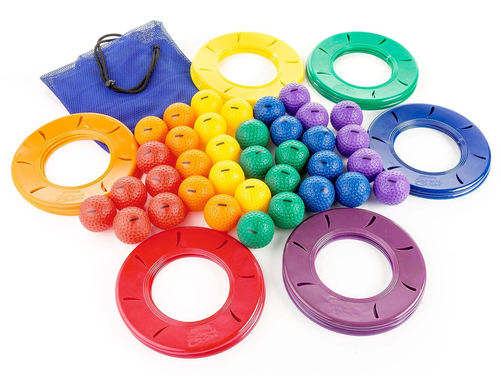 ScrambleScore discs are made of 9″ dia vinyl with a 5″ dia center hole to contain the balls. Golf balls are made of vinyl, making them ideal for use indoors or out. Set includes 18 ScrambleScore discs, 36 golf balls, a VersaBag mesh storage bag, and activity instructions with exciting game options!