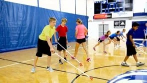 One team variation includes setting up 30 bowling pins (not included) in alternating colors lengthwise across the center of the gym. Teams line up on opposite sides, and each player gets a cue and two discs. Players shoot their discs, trying to knock down all the pins in their opponent’s color. The first team to accomplish this, wins.