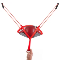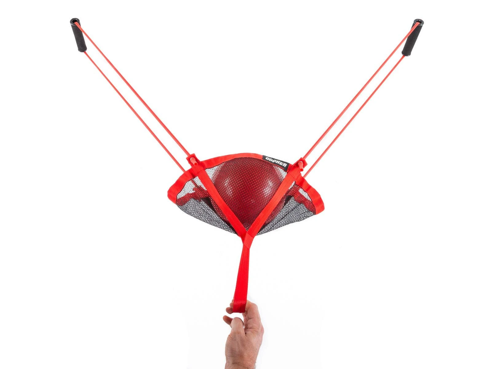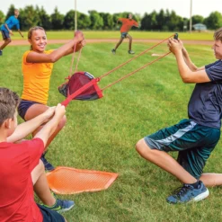Add a fun twist to traditional baseball, softball, and kickball units with SlingShot Derby! Instead of hitting or kicking a ball, players use a specially-designed sling shot to launch balls into play. Two players hold the handles on the sides of the launcher as a third student pulls back on the large 17″ dia cradle to fling the soft game ball. Launching ball allows for greater success by players of all skill levels.
