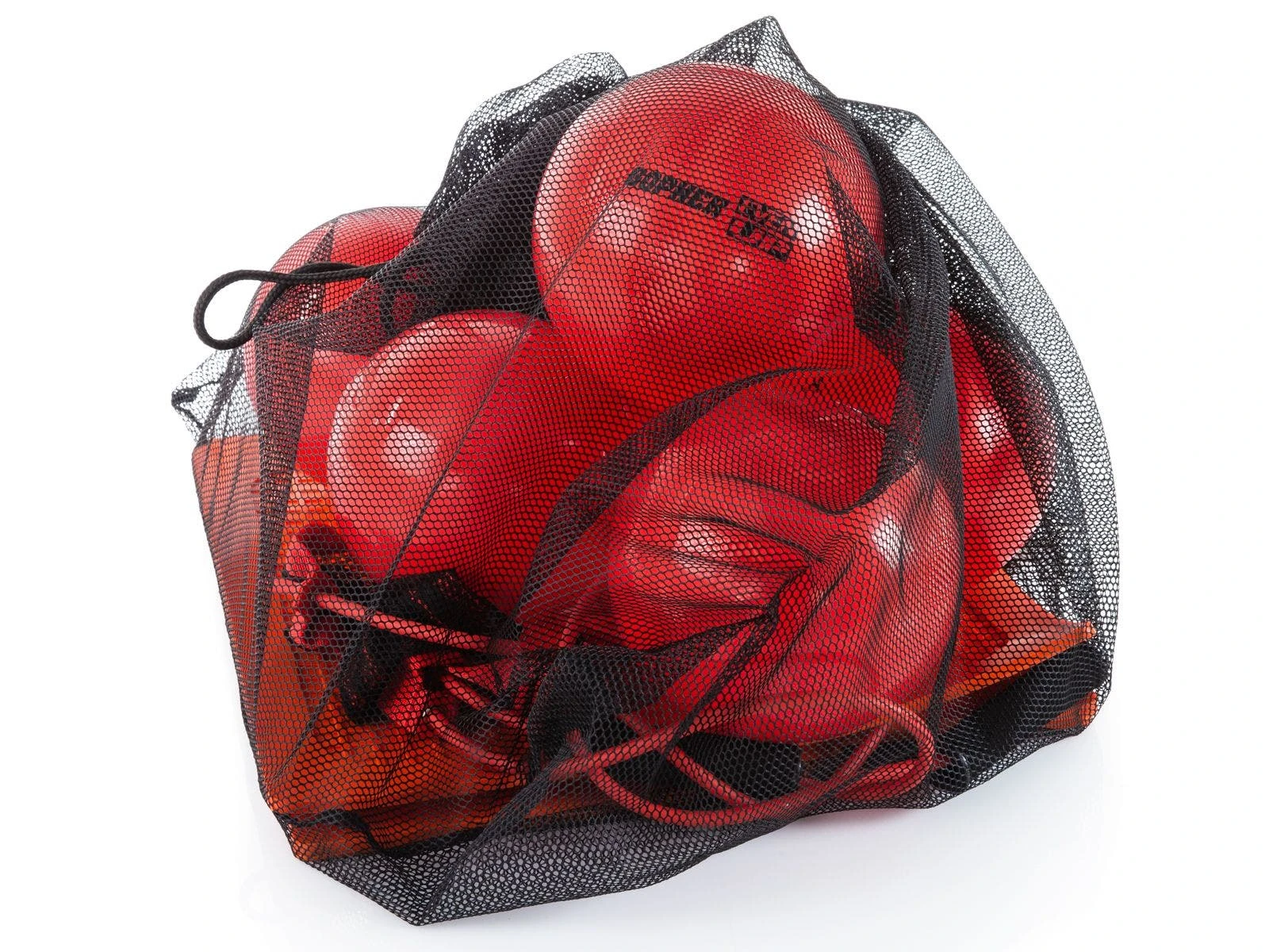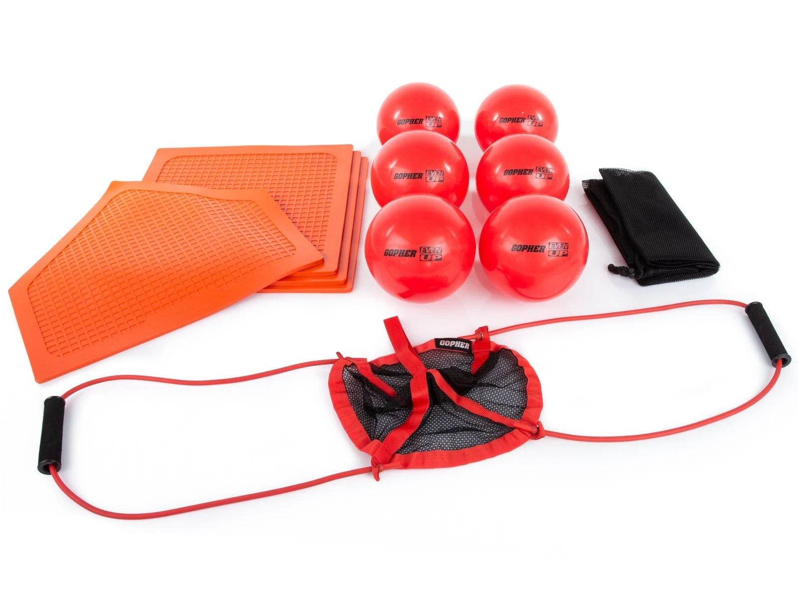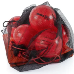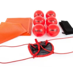 The launcher weighs only 11 oz, making it easy to handle. It includes 5″L plastic handles with soft, comfortable grips. The launch cradle is made of nylon and mesh for dependable durability. Latex bands on the launcher are 22″L. Oversized bases encourage safe play as players round them during plays. Set includes 2 launchers, 6 balls (7″ dia), 4 bases, a VersaBag mesh storage bag, and activity instructions.