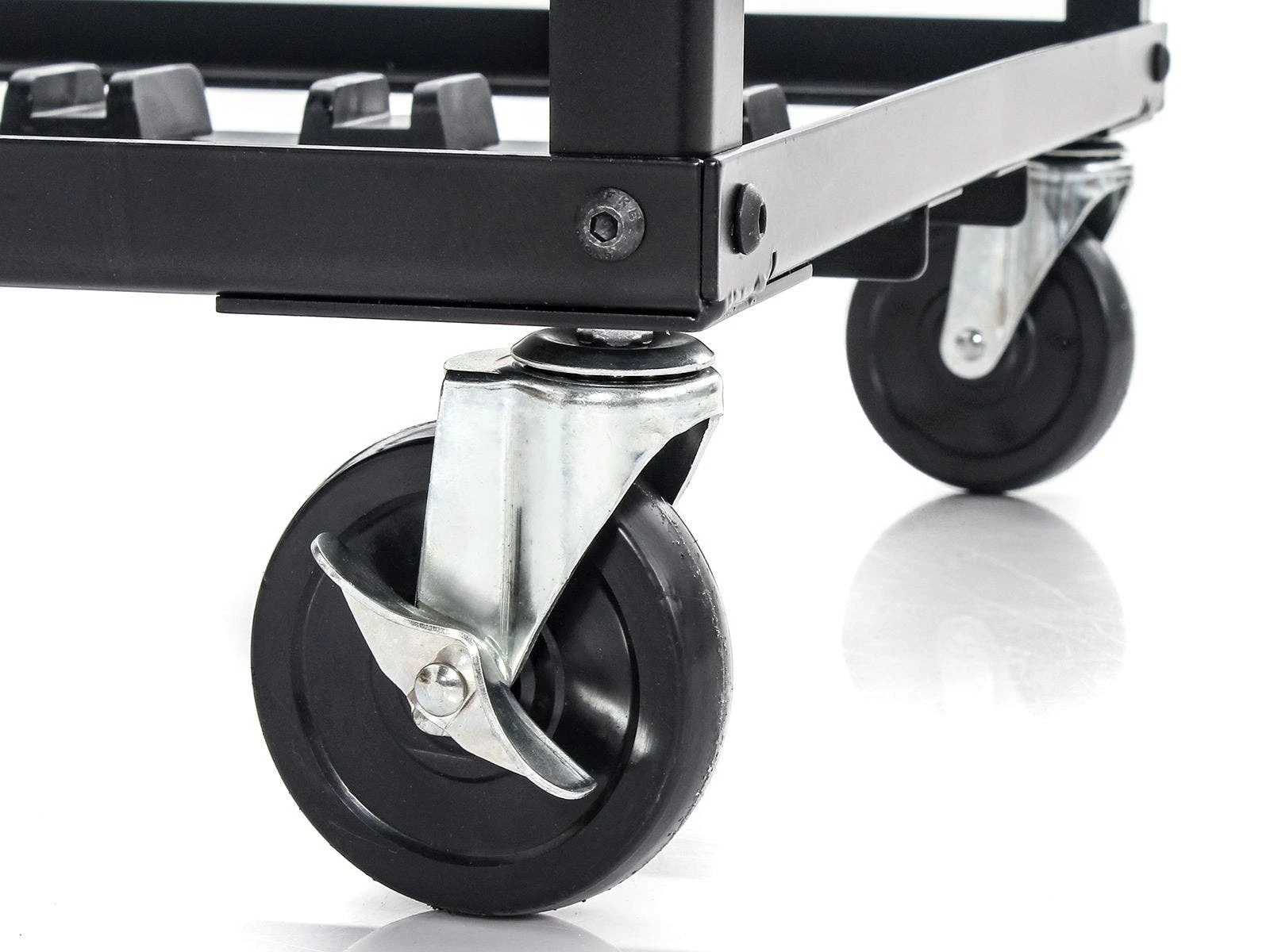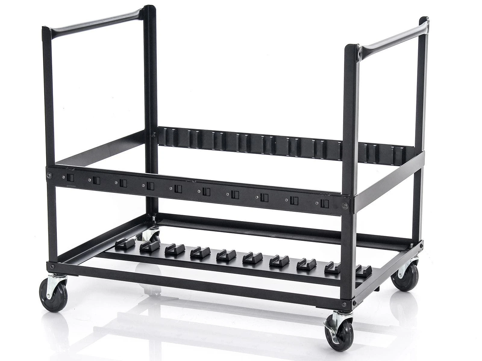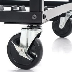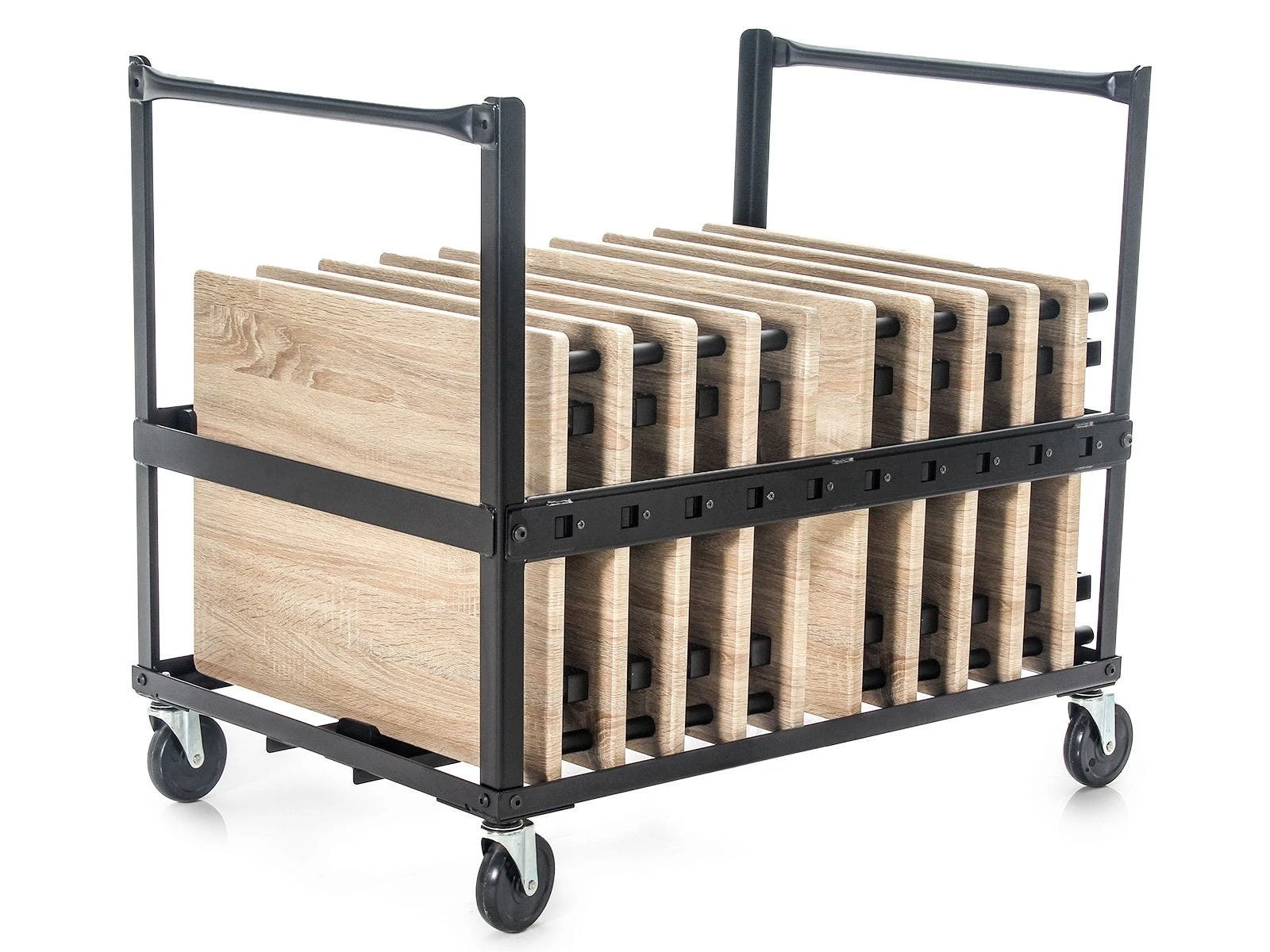 A wood-patterned melamine top looks sharp in any classroom and features a tapered user-facing edge for increased comfort during use. Black powder-coated steel frame construction resists scratching and lasts for years. All in all, this desk supports up to 75 lb. Available individually or in a set of 10 with a custom black powder-coated steel cart featuring four 4” casters (2 locking) and EVA foam-padded slots for up to 10 desks. Tabletop Desk is 24”W x 18”D; 12 lb. Cart is 35-1/2”W x 25”L x 31.5”H; 55 lb.