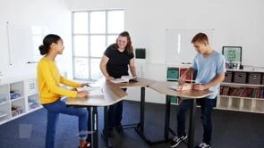 Versatile 6-sided standing desks allow for creative layouts that encourage students to collaborate and work closely together. Modular design is quick and easy to arrange to meet your needs, from pairing off partners to grouping larger teams for class experiments. All arrangements offer everyone a full view of the task at hand, allowing for equal opportunity for participation.