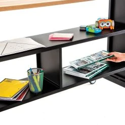 Three built-in 12″W storage compartments allow students to store books, laptops, and other school supplies with ease. When group work continues, materials are on-hand which reduces prep time. The center also includes four 3″ dia smooth-rolling casters so it’s a breeze to move the desk around the room. Casters are non-marring to protect floors and lock so the desk stays in place.