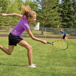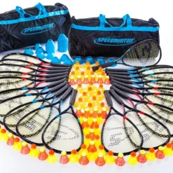 Sets ensure you have the gear needed to play anywhere. Ultra light aluminum racquets offer great handling and superior durability. School racquets are a traditional racquet, while Fun rackets are shorter and easy to control. Speeders have plastic cones that easily stand up to use on any surface. Match speeders are ideal for competitive play and travel up to 100′, Fun speeders are suitable for beginners and travel up to 65′, and Heli speeders are ideal for smaller spaces as they travel up to 30′.