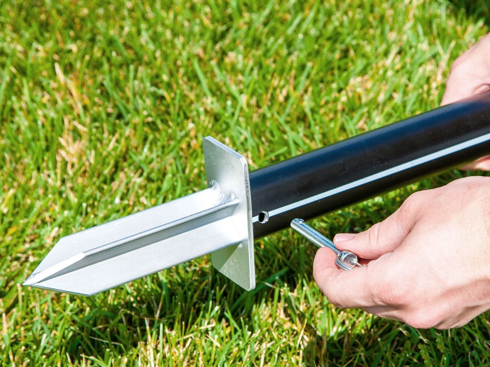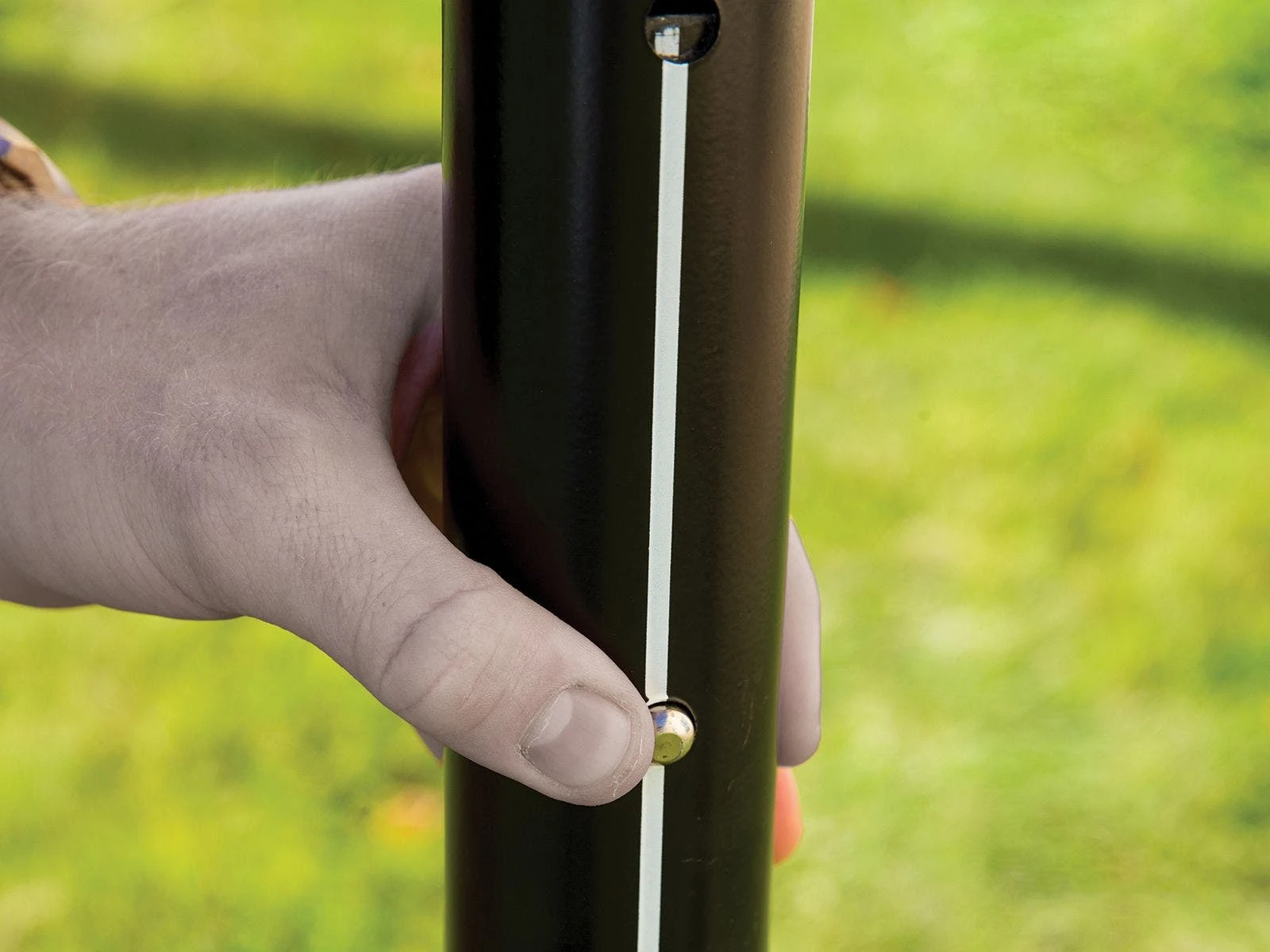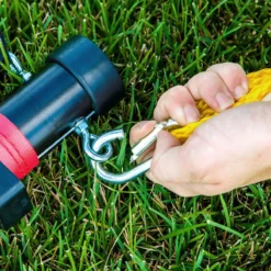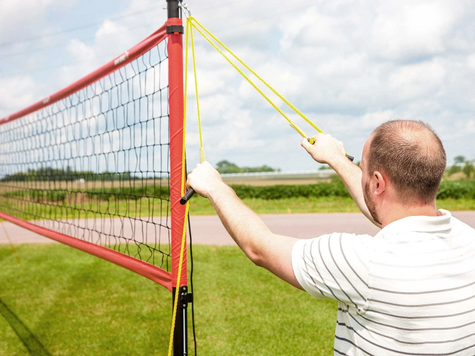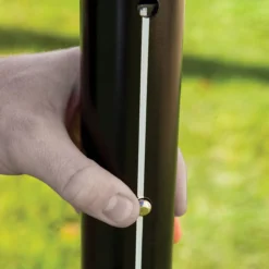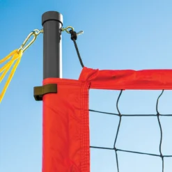 Durable outdoor system features 2” dia aluminum poles and staked ends for greater stability. Dual tensioning system includes guy ropes and a support rope that runs through the net’s top band. The guy ropes include carabiners for quick attachment and handles for easy adjustment. Simply slide those handles or adjust the top rope to alter the net tension!