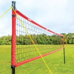 Every part of this net system is designed for stability and tough play in institutional settings. Durable 2” dia aluminum poles feature staked ends for stability. Four, 5/16″ dia guy ropes and molded handles make tightening the net easy. A set of four 12”L galvanized steel stakes keep the guy rope system tight. Red boundary markers stake into the ground, ensuring they stay put during play.