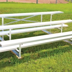 Built for enhanced strength, the galvanized-steel frame increases the durability and longevity of these bleachers. It is resistant to corrosion and heavier than aluminum only options, making the bleachers ideal for outdoor use. When used indoors, floor protectors keep gym floors free of blemishes. The 10″W x 2″H extruded-aluminum seats are constructed to support 125 lb per linear foot.