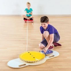Gear up your students to learn about mechanical advantage by letting them experience the force required to pull a classmate on a scooter using a rope. Then show them the powerful advantage of reeling their classmate in using a gear and pulley system! One large and one small gear demonstrate the difference in force required to pull a student when gearing up or down. Rubber feet are safe for use on most surfaces. 46″L x 23″W x 6-1/2″H; 36 lb.