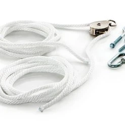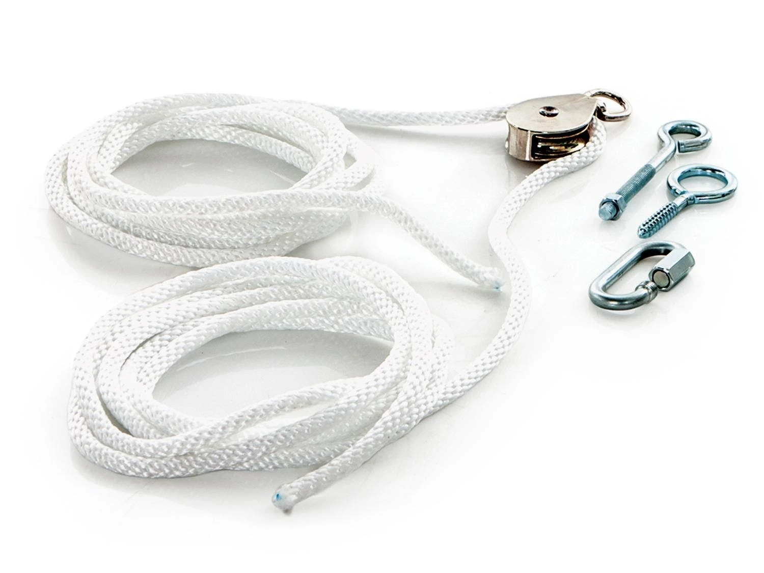Pulling oneself across the gym floor is demanding work. Students will appreciate how much easier it is when they are connected to this wall pulley system! It demonstrates a simple pulley system, which is a simple machine that changes the direction and intensity of a force. Includes large screw eye, latch, pulley, and 25’L rope.