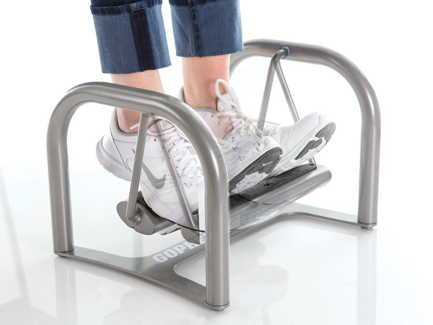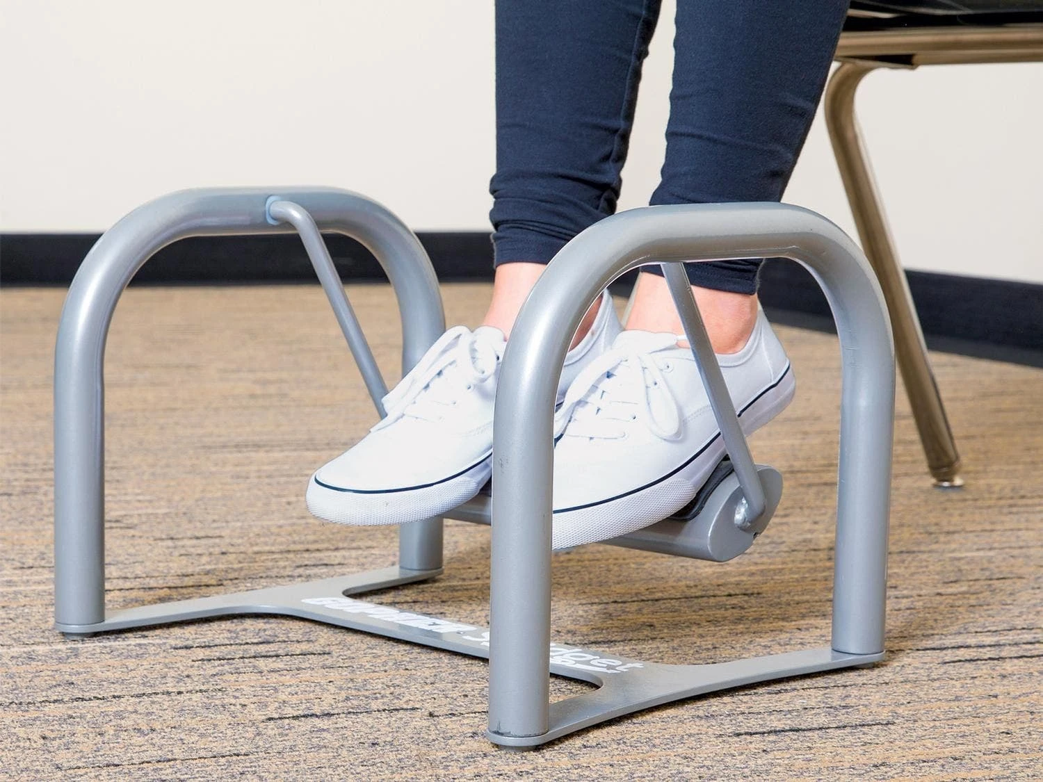 Pendulum-style foot swing fits under desks, allowing for non-disruptive and silent movement. Both feet swing together on the 11″W riveted foot pedal. Powder-coated steel design is built strong for any setting. Foot swing is 16-1/4″ W x 13-1/4″ x 11-1/4″ H; 13-1/2 lb.