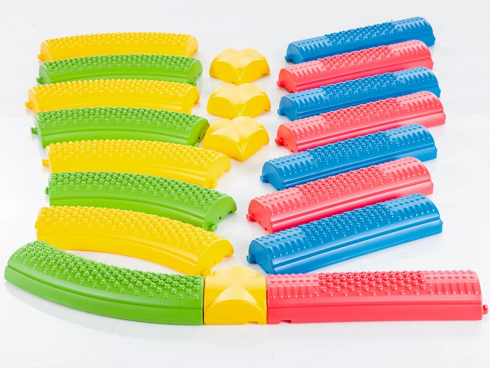 Raised bumps on the surface of each section create a sensory trigger experience as students walk across. These same bumps also provide slight grip, assisting students as they master balance. Sloping sides encourage balancers to challenge themselves naturally. Students can sense the slope as they step forward, allowing them to correct their footing quickly.