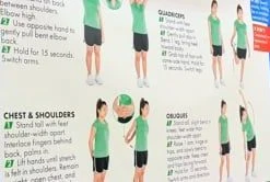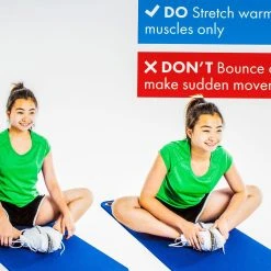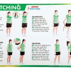 This set includes 2 banners, both consisting of 4 stretches, showing students how to stretch their entire bodies before and after play. This in turn can aid in reducing injuries and improve muscle recovery time. Students simply follow along with the images and step-by-step instruction to complete each move. “Do and Don’t” tips offer additional guidance. Featured stretches work the hips, thighs, calves, hamstrings, triceps, quadriceps, chest and shoulders, and oblique muscles.
