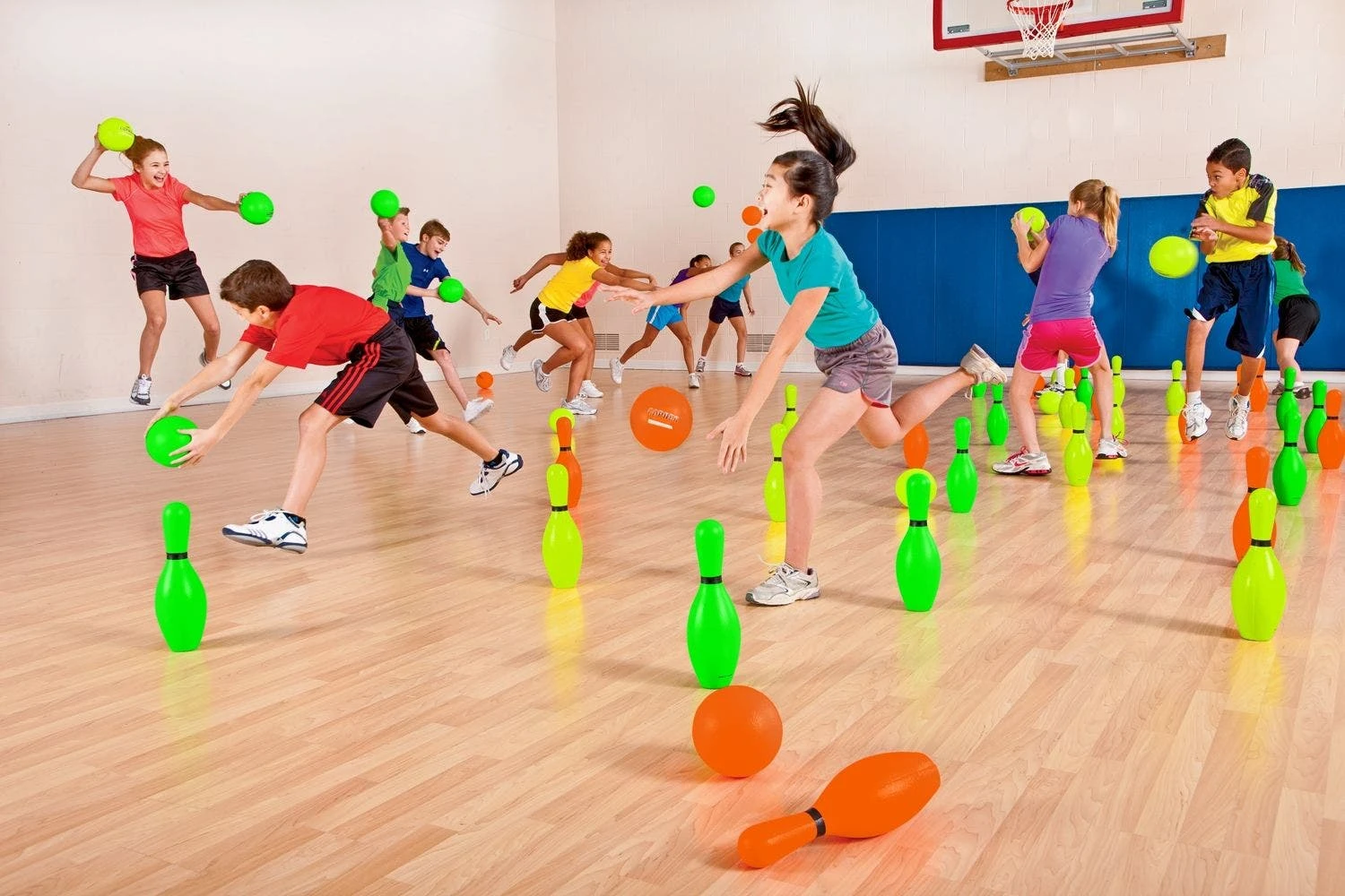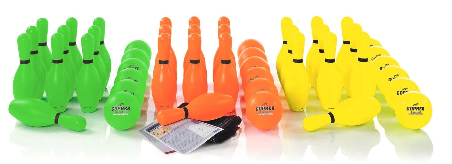 In a variety of action-packed games, 3 teams of 10 or more players either attempt to knock down their own pins or their opponents’ pins while protecting their own. Exciting Screamin’ colors are fun for students and help teach teamwork, agility, accuracy, and dodging skills.