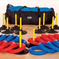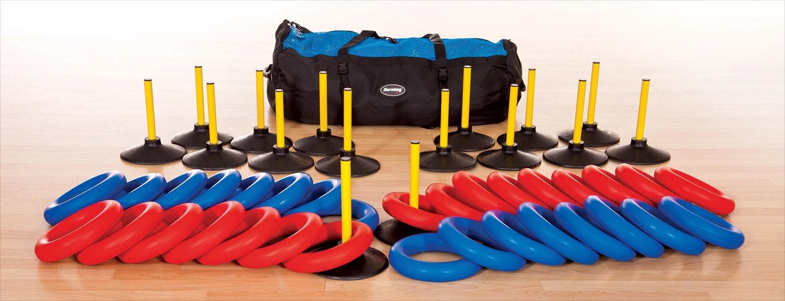 With 16 goal and 32 foam rings, this ring tossing set includes enough equipment for up to 8 courts. This allows up to 32 players to play simultaneously. Easily divide students into teams thanks to distinct blue and red rings. Rings make it easy to keep track of each player’s tosses, and allow for easy counting at the end of the match by simply identifying the colors stacked up on the post.