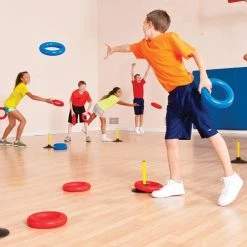 Heavy-duty goals have a wide, stable rubber base with a 9-1/2″H PVC post so they won’t tip over during game play. Durable 10″ dia foam rings are lightweight and safe, yet fly true when tossed indoors. Set also comes with a DuraBag duffel for easy transportation from the storage closet to the gym. It also keeps everything within this set organized and safe while in storage.