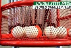 - Holds up to 50 hockey sticks or 20 official basketballs; universal storage