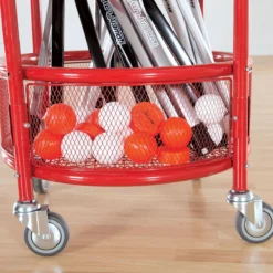 This circular cart features a powder-coated 1-1/4″ dia steel trellis frame that stores everything you need to play the game. Open framework allows students to see what’s inside from far away, and circular design allows them to grab their favorite ball from any angle. Mesh lining around the bottom quarter keeps smaller items secure inside. Four swivel casters (2 locking) make it easy to transport for both indoor and outdoor use. A 360-degree handle provides unmatched maneuverability and control.