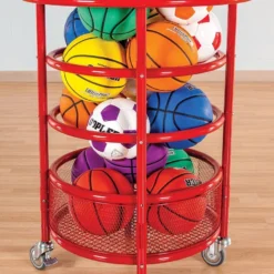 This circular cart features a powder-coated 1-1/4″ dia steel trellis frame that stores everything you need to play the game. Open framework allows students to see what’s inside from far away, and circular design allows them to grab their favorite ball from any angle. Mesh lining around the bottom quarter keeps smaller items secure inside. Four swivel casters (2 locking) make it easy to transport for both indoor and outdoor use. A 360-degree handle provides unmatched maneuverability and control.