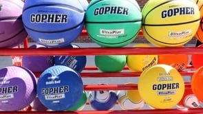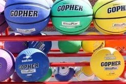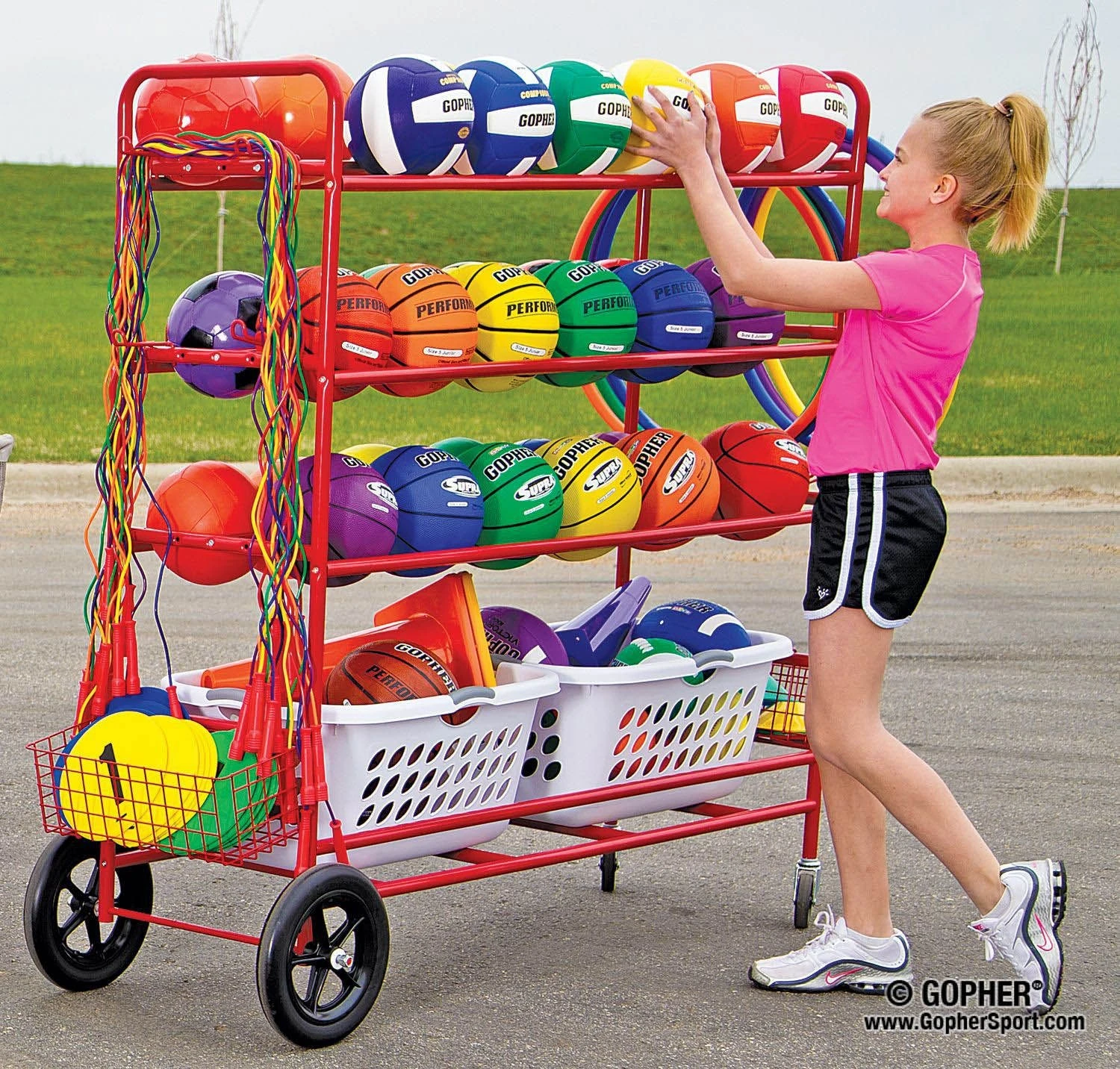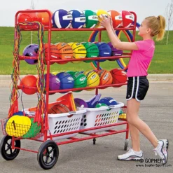 Three double-wide tiers of shelving accommodate up to 30 balls of 28” dia, making them immediately accessible from both sides of the cart. Four hooks accommodate jump ropes and hoops without blocking access to balls. Below the hooks are 2 removable wire mesh baskets that are ideal for housing smaller balls and equipment, such as baseballs or disks. Two plastic bins sit nicely atop the bottom rungs of the cart to house miscellaneous equipment. Cart measures 60”L x 22”W x 62-1/2”H; 55 lb.