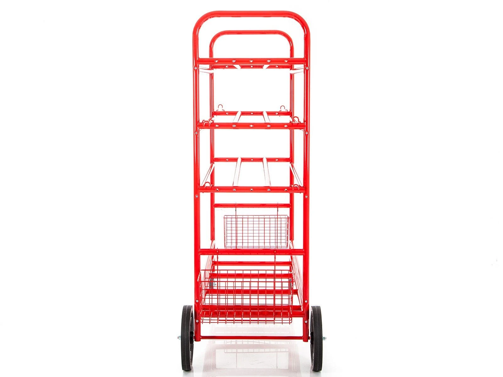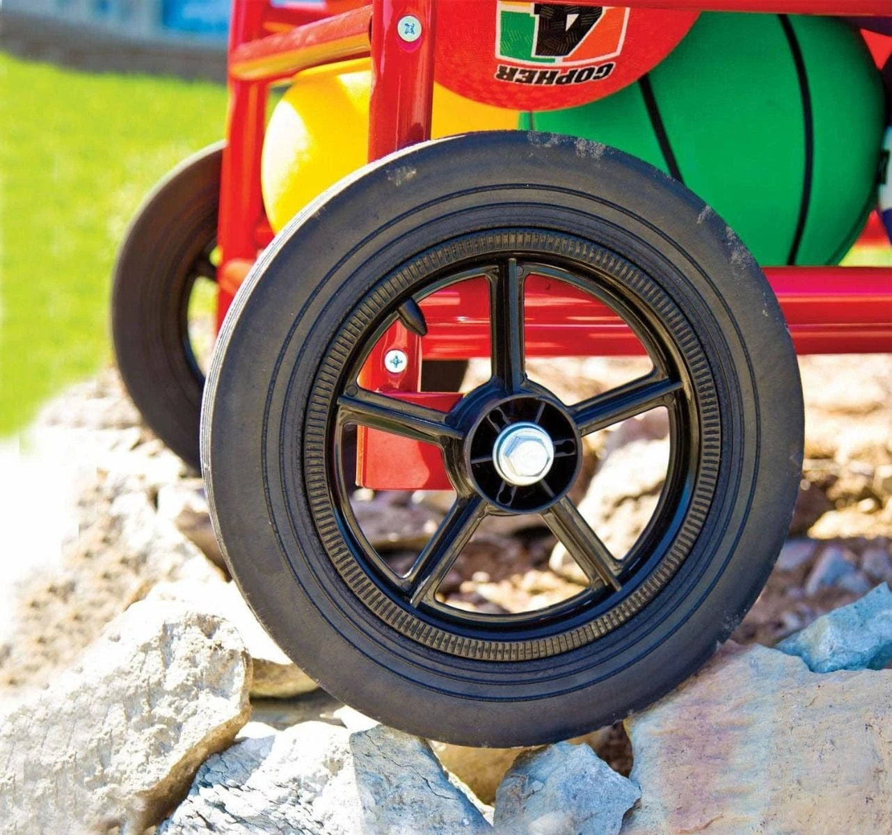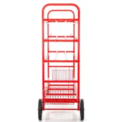 With slots for all types of activity balls and bin storage for equipment, activities abound from this cart! A durable 1-1/4” tubular steel construction and easy handling make it a reliable option both indoors and out. A powder-coated finish protects against blemishes, marring, rust, and erosion. Two 4” ball bearing swivel casters and two 12” all-terrain wheels increase mobility while a convenient handle provides optimal handling through tight doorways.
