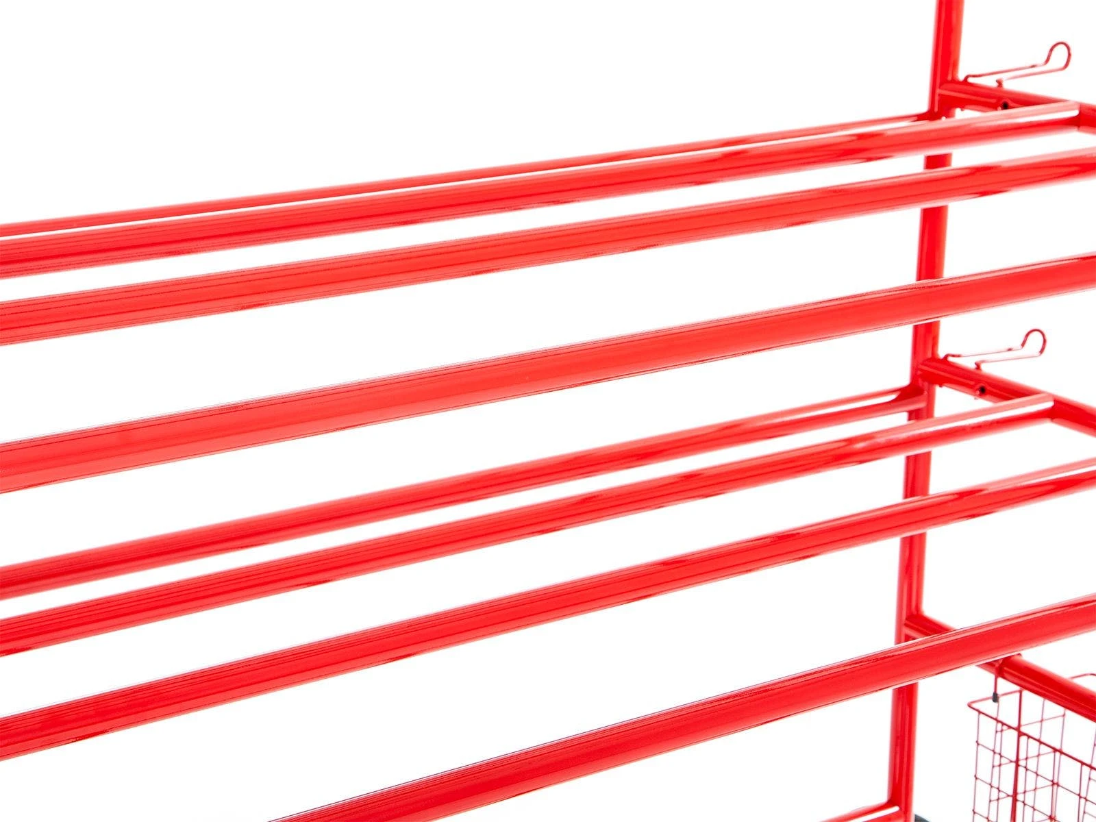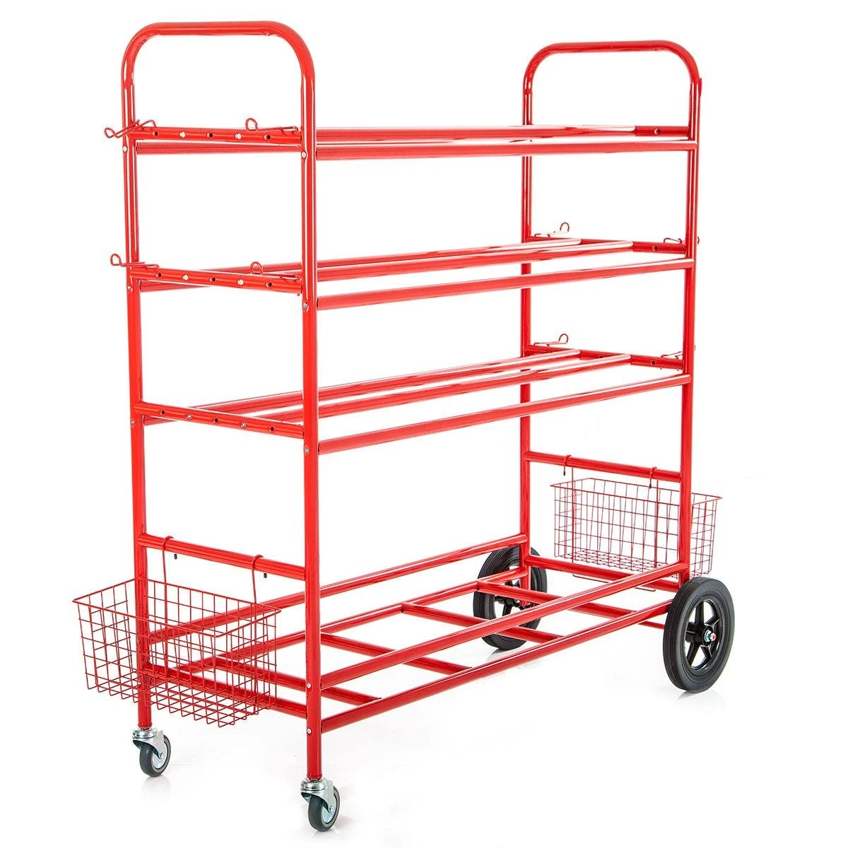 - Features 4 hooks, 2 removable wire baskets, bottom shelf, and 3 double-wide tiers for balls