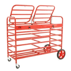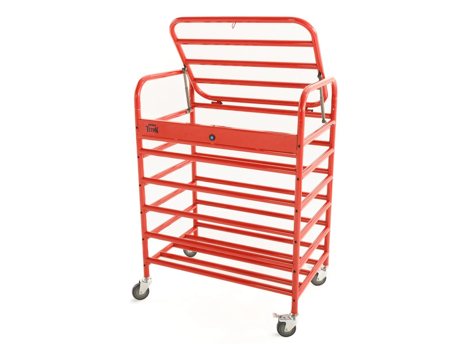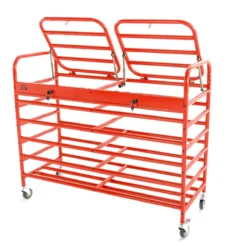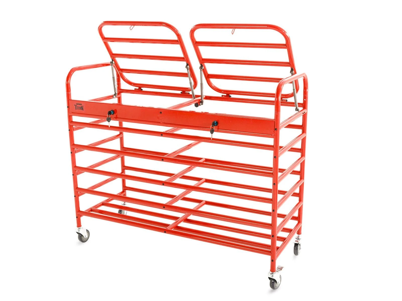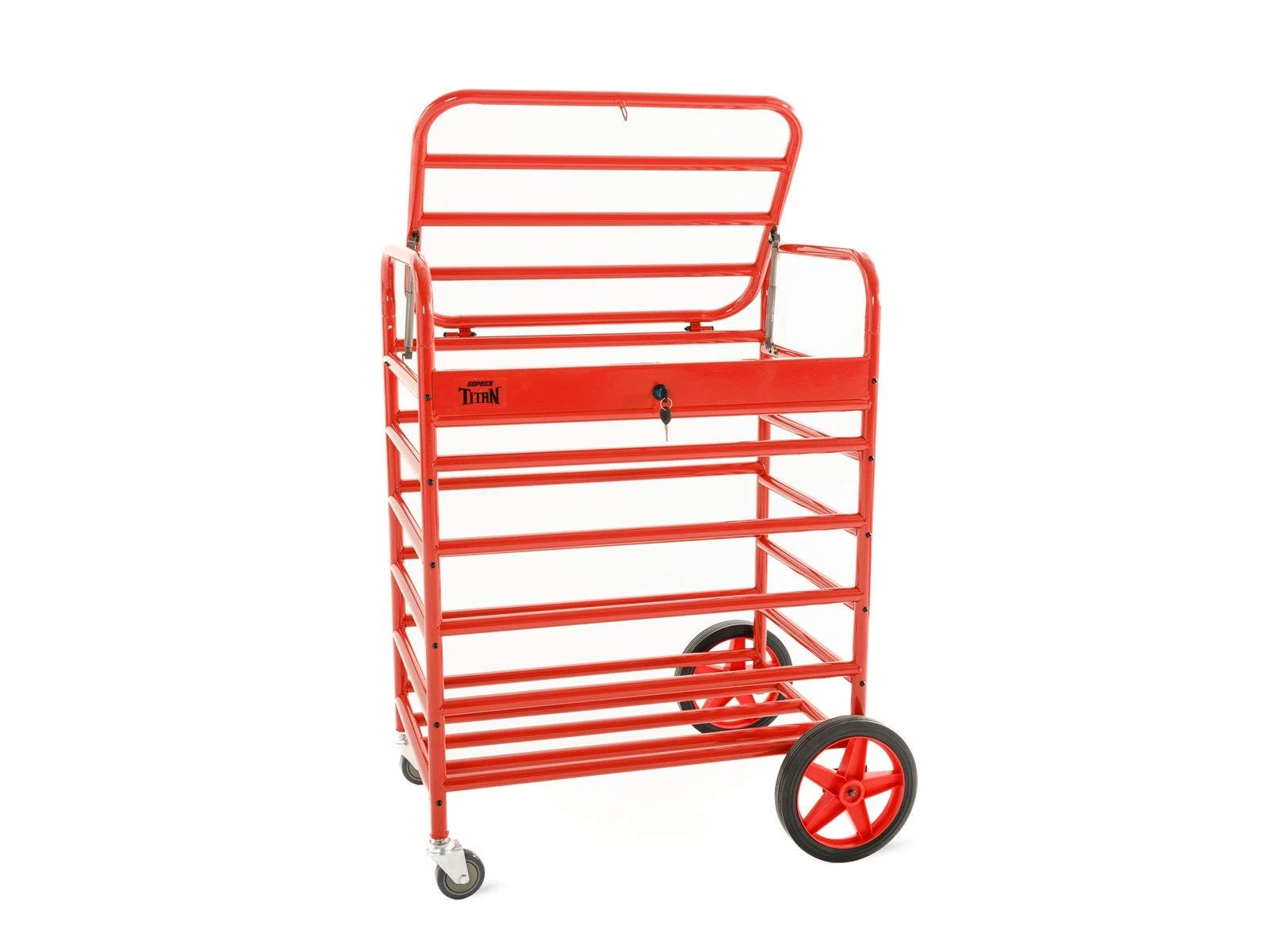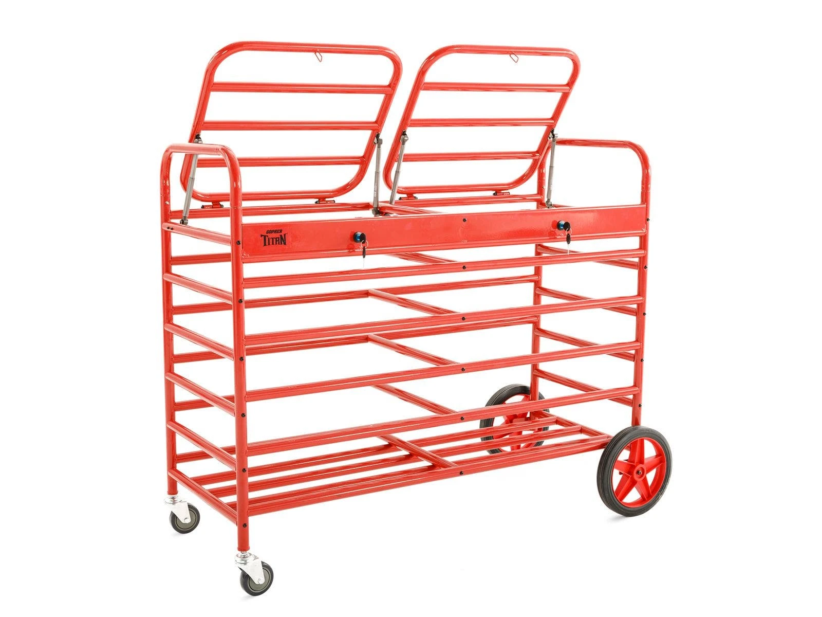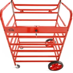 These extra-strong carts are made of 1-1/4″ powder-coated steel tubing with added welding for lasting performance. They feature an upgraded and safer gas hinge that prevents the lid from closing unintentionally. It will stay open until it is purposefully pushed down. A built-in lock-and-key system ensures that you remain in control of the cart at all times, and no one can tamper with equipment when not in use. The Indoor Cart has four 4″ dia ball-bearing swivel casters (2 locking), while the All-Terrain version packs two 4″ dia ball-bearing swivel casters and two 12″ dia all-terrain wheels.