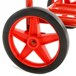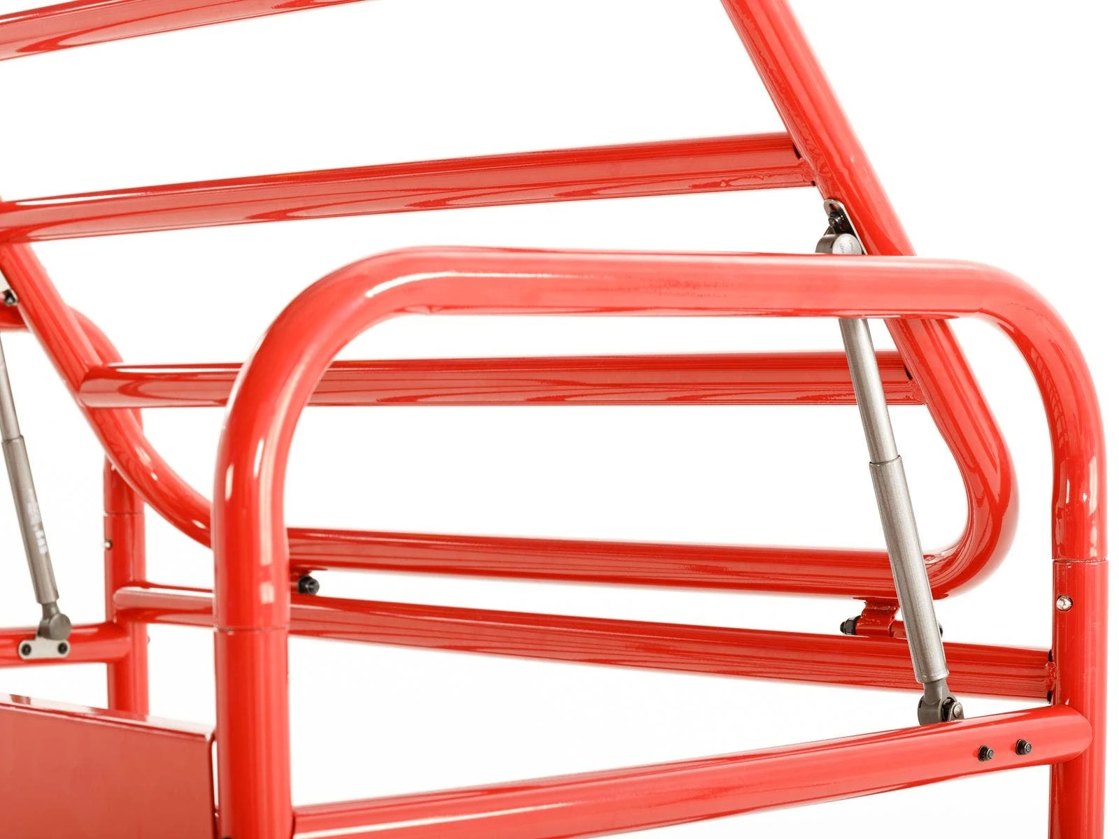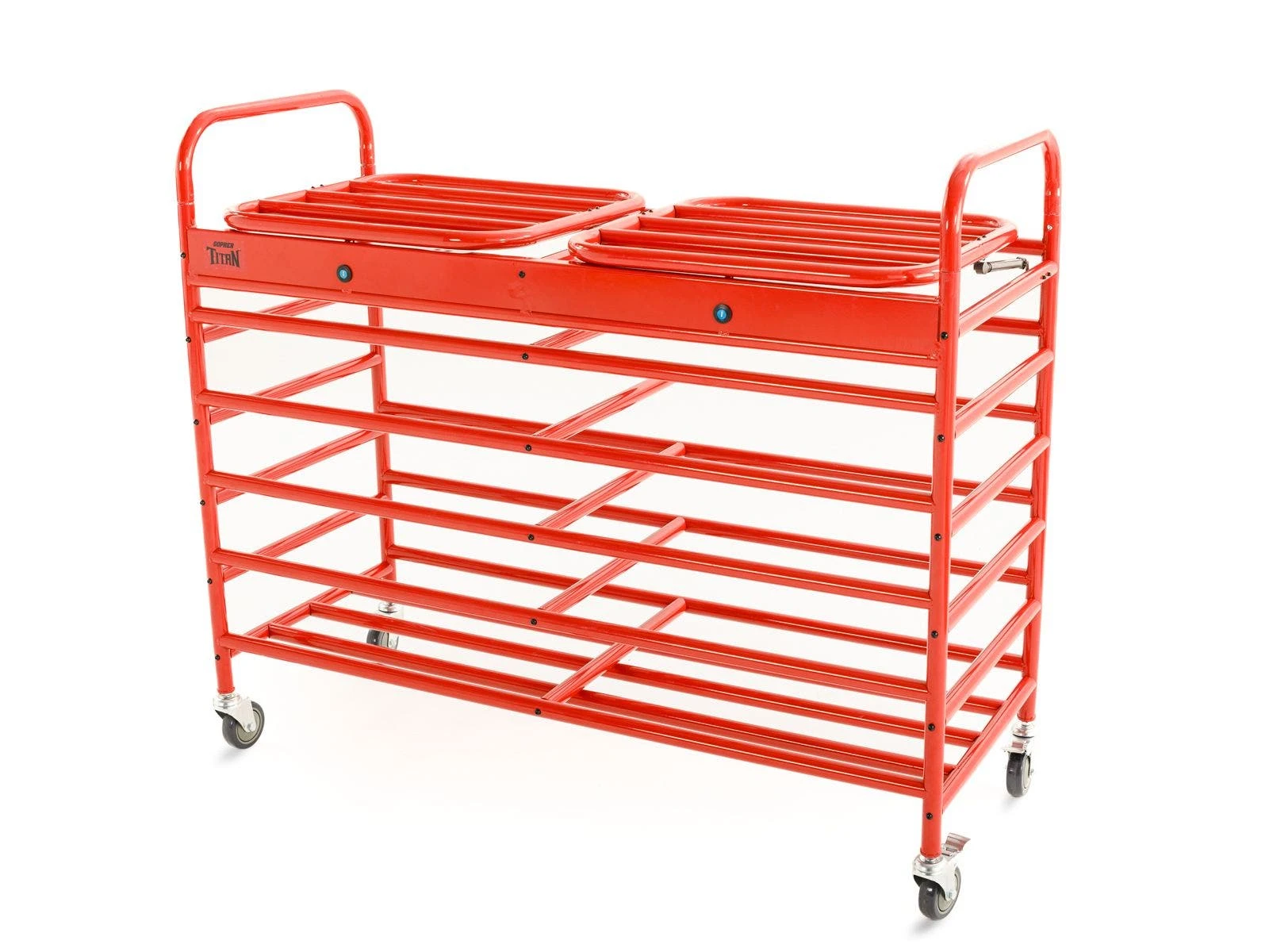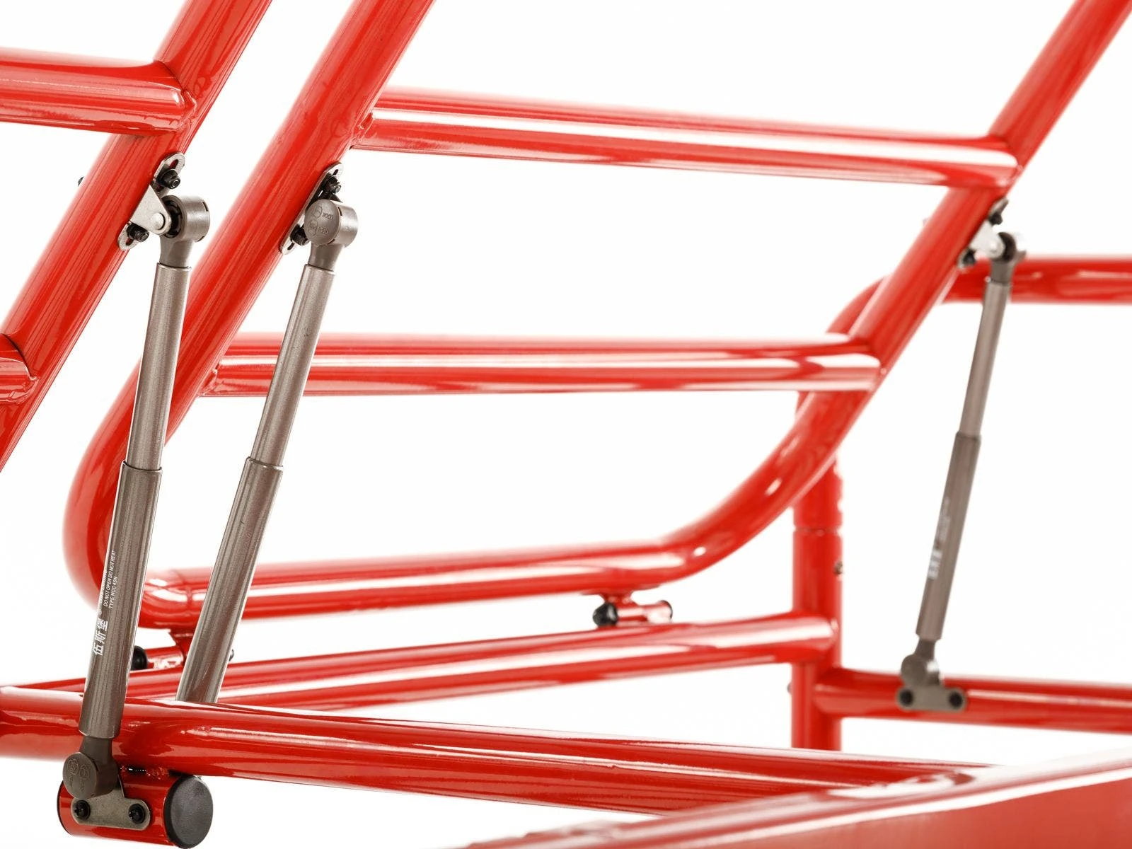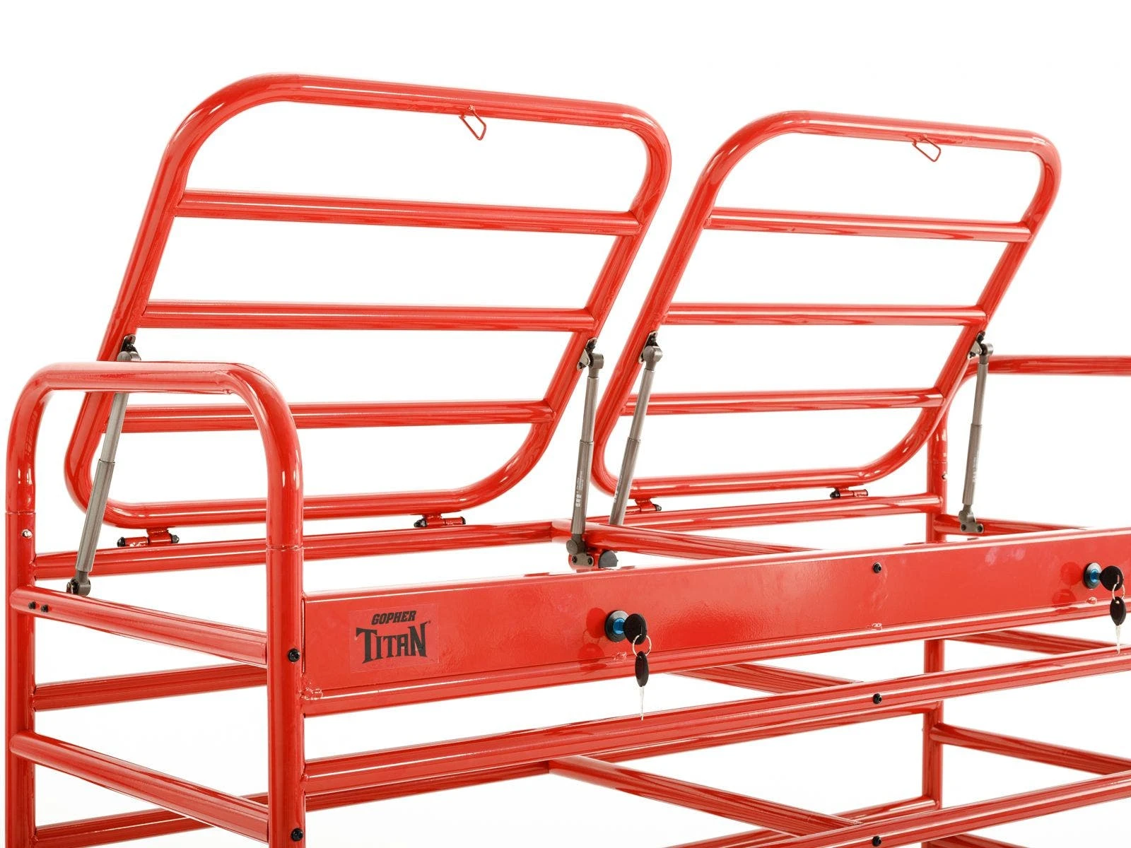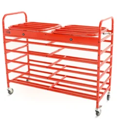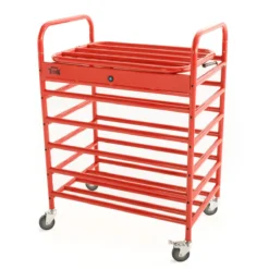 These extra-strong carts are made of 1-1/4″ powder-coated steel tubing with added welding for lasting performance. They feature an upgraded and safer gas hinge that prevents the lid from closing unintentionally. It will stay open until it is purposefully pushed down. A built-in lock-and-key system ensures that you remain in control of the cart at all times, and no one can tamper with equipment when not in use. The Indoor Cart has four 4″ dia ball-bearing swivel casters (2 locking), while the All-Terrain version packs two 4″ dia ball-bearing swivel casters and two 12″ dia all-terrain wheels.
