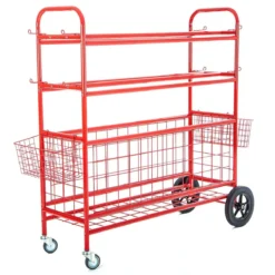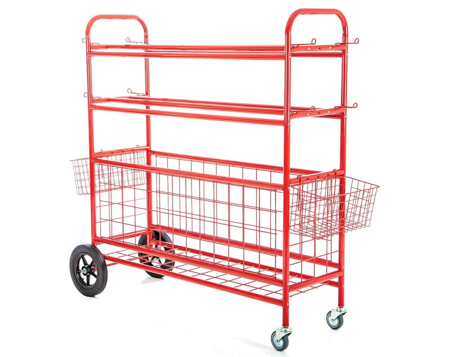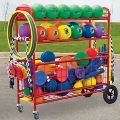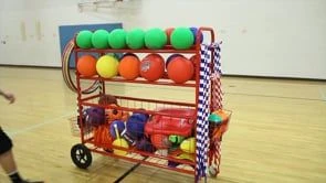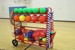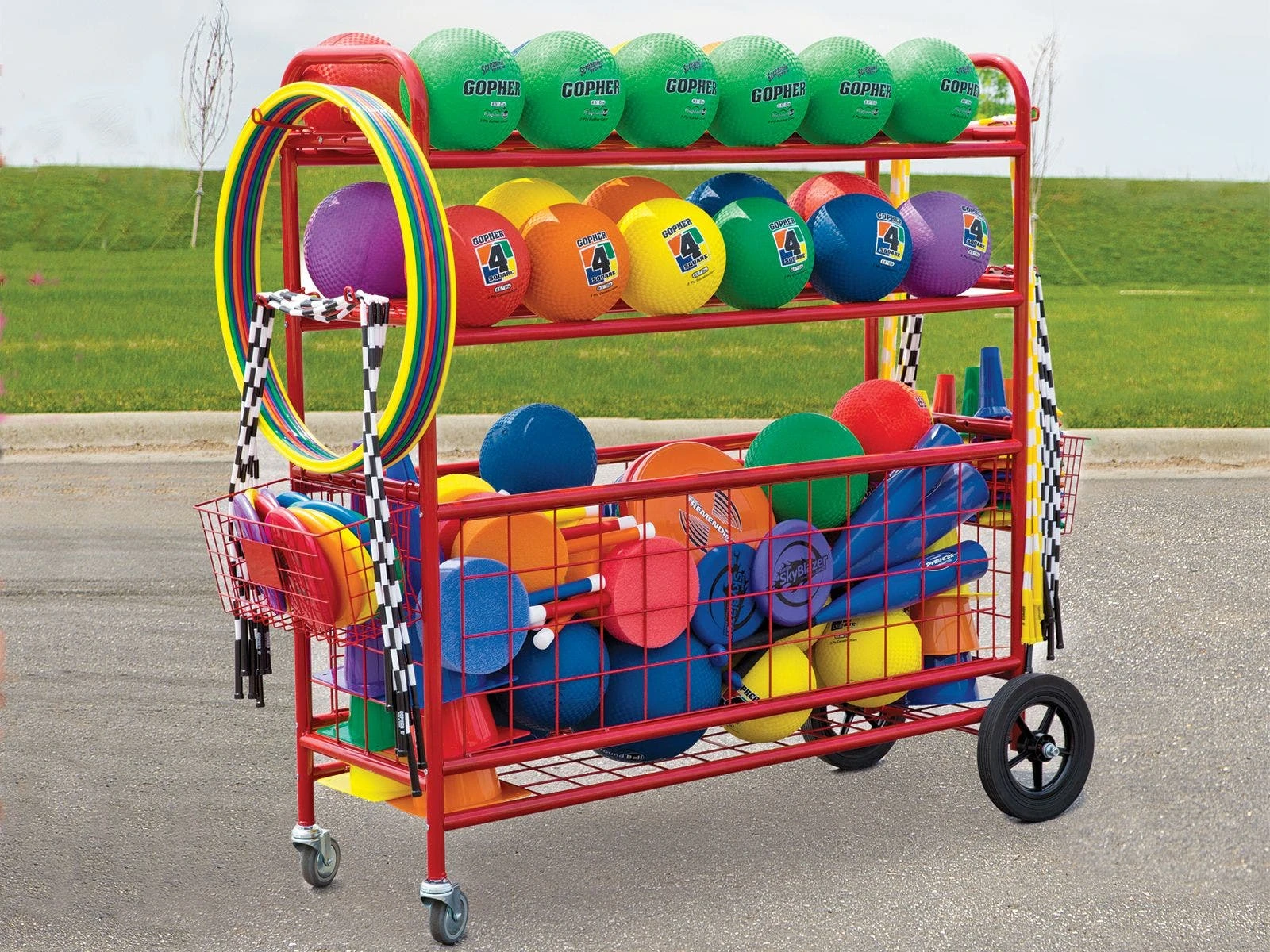 This accessible cart makes sure nothing is left out when it comes outdoor playground storate! Two tiers of double-wide ball racks accommodate 20 balls of up to 23”dia, while a bottom rack holds miscellaneous loose equipment and additional activity balls. Hooks on both sides hold hoops and jump ropes, preventing tangling. Two removable baskets hold smaller items and can also be quickly and securely hooked into place.