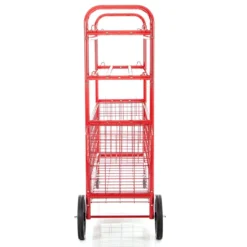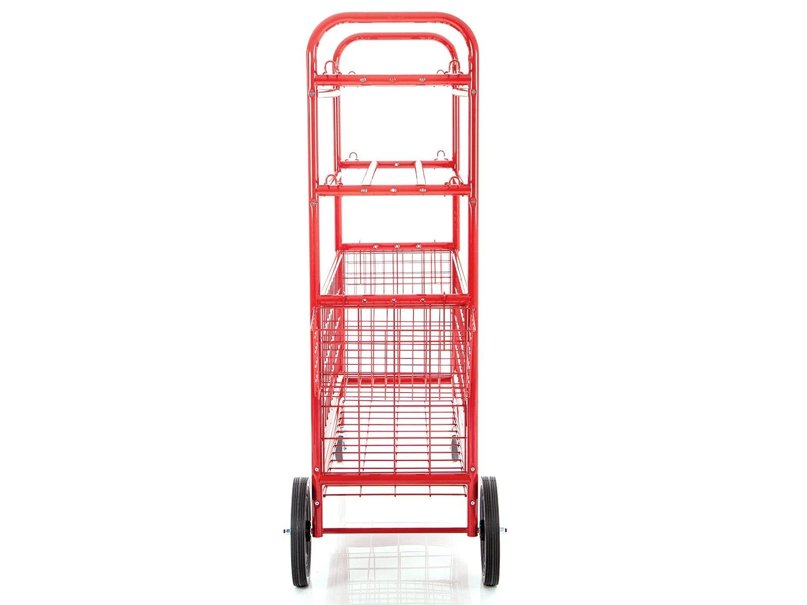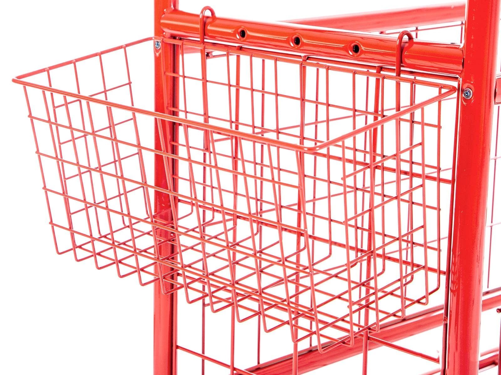- Stores 2 double-wide shelves, end hooks, and 2 removable mesh wire baskets