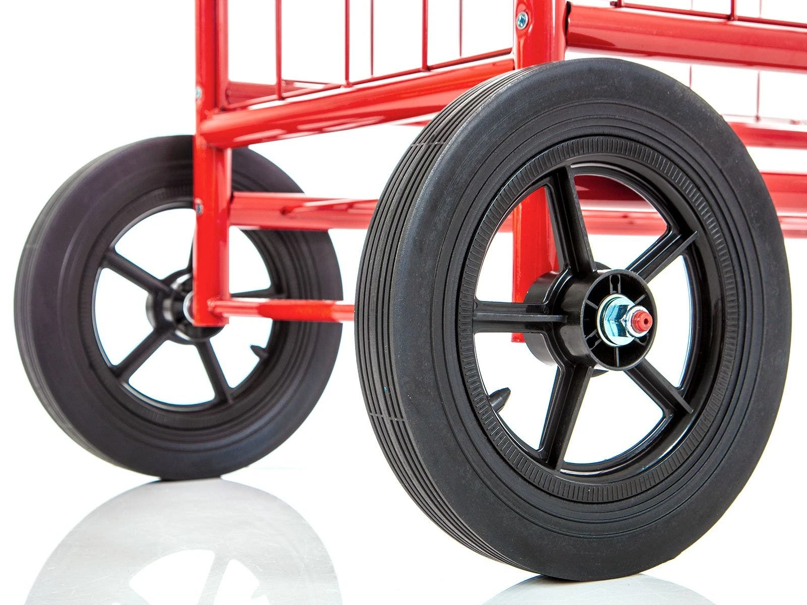 - Features two 12” all-terrain wheels and two 4” swivel casters